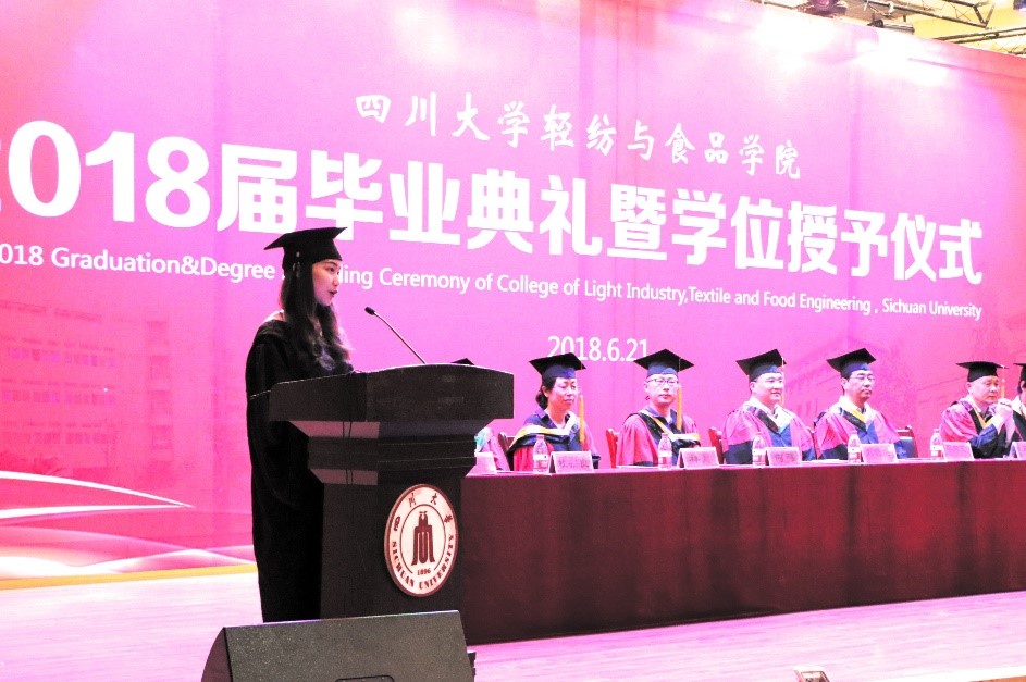 Graduate representative, clothing and costume design professional student, Yanqing Ma reviewed the experience of college of Light Industry, Textile & Food Engineering in Sichuan University in the past four years, thanked the school and the college culture for their profound influence, and called all the graduates to bravely pursue the infinite possibilities.