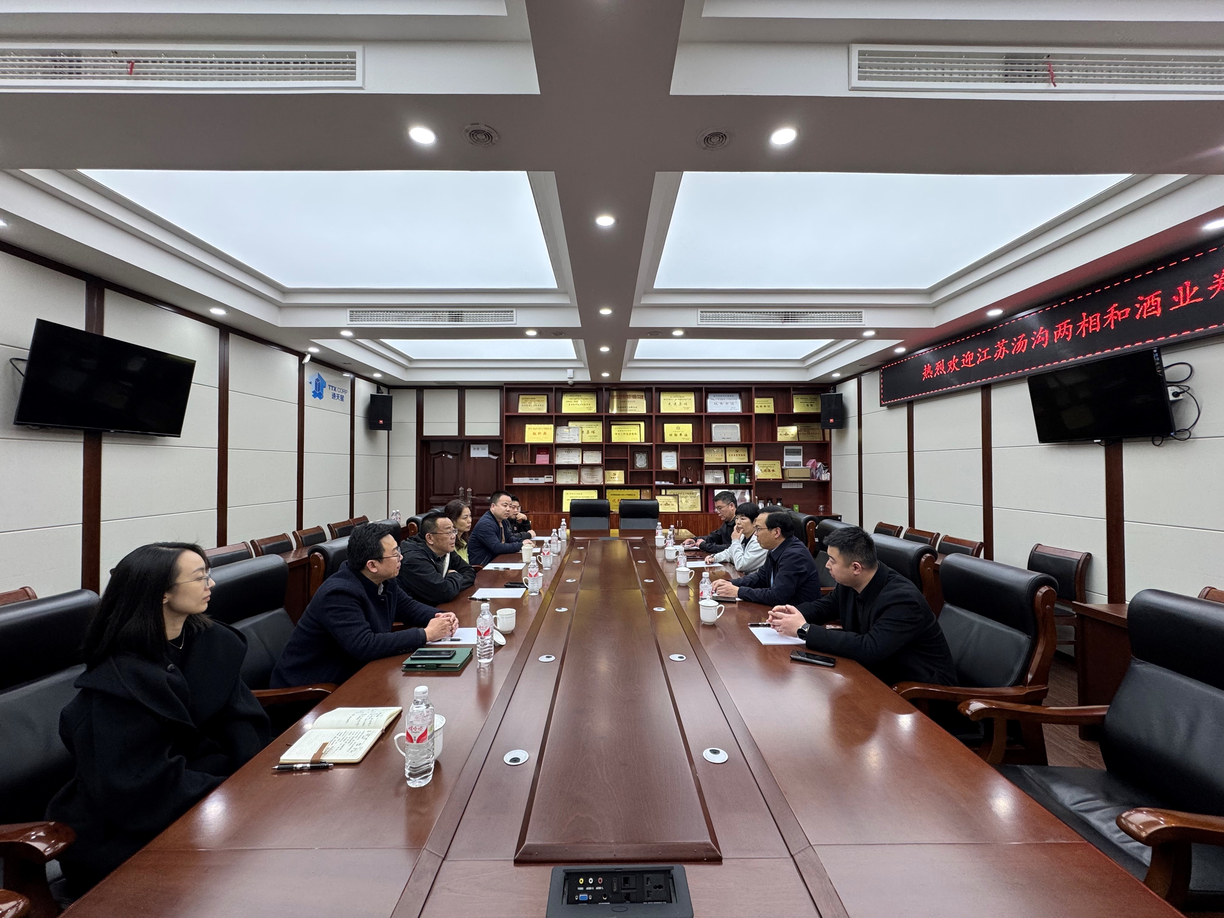 2025年3月24日,江苏汤沟两相和酒业有限公司(以下简称“汤沟酒业”)总经理郑军率队莅临公司进行参观交流,并与太阳成集团tyc33455cc先进酿造科技创新中心主任许正宏教授、迟原龙教授等就产业合作、人才培养以及科研项目合作等问题展开深入交流,会议由迟原龙副经理主持。