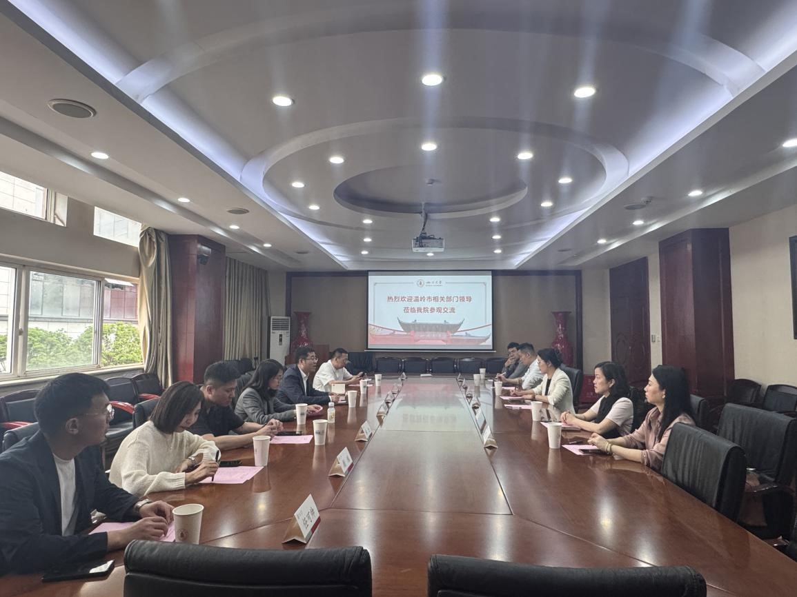 2025年4月16日上午,温岭市相关部门领导一行在温岭市城北街道党工委王俊杰书记的带领下来到太阳成集团tyc33455cc进行交流访问。此次会议旨在深化校地合作,推动科技成果的转化与应用,为地方经济发展和产业升级提供智力支持和技术保障。