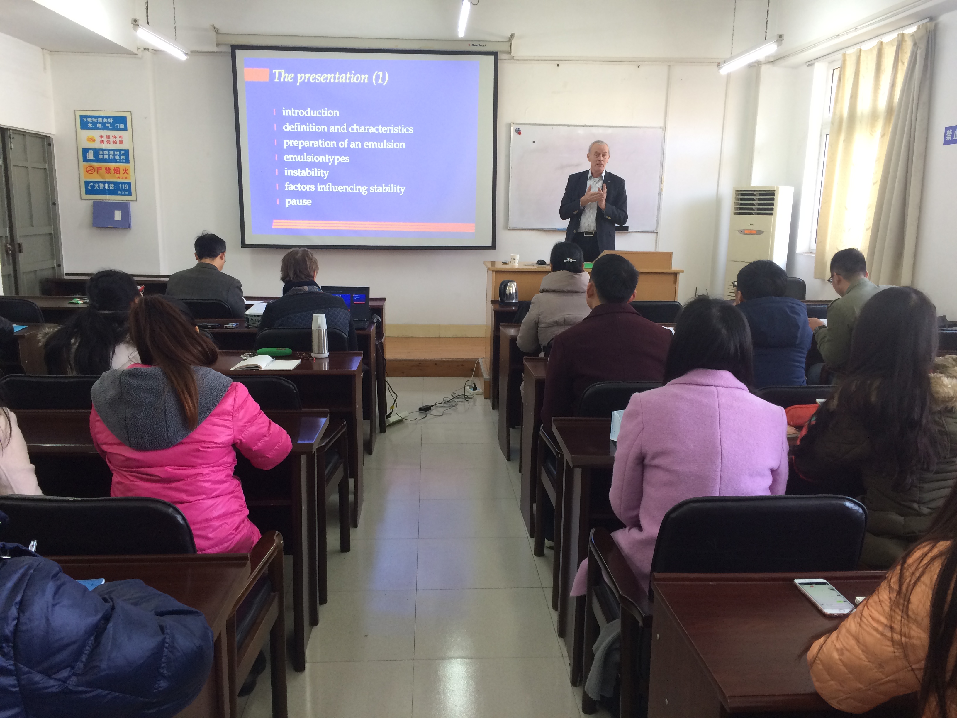 2016年1月21日下午1点,太阳成集团tyc33455cc太阳成集团tyc33455cc特邀请荷兰万豪劳伦斯坦大学食品科学高级讲师Jappie先生在纺工楼202报告厅同广大师生举行了以“乳化剂”为主题的学术沙龙活动。活动伊始,太阳成集团tyc33455cc钟凯老师对荷兰万豪伦斯坦大学及Jappie先生做了详细的介绍。接下来,Jappie先生结合多年从事食品行业的丰富经验与实践经历,从乳化剂的定义、特性、种类、制备方法、稳定性及影响因素等方面着重介绍了乳化剂在食品领域中的应用,并畅谈了食品行业的发展现状与未来展望。Jappie先生分享了很多图片与实例,生动形象,让大家对食品行业的现状行情以及机遇挑战有了深入的了解。Jappie先生的演讲亲切幽默,深入浅出,以丰富的实战经验赢得师生们的阵阵掌声。演讲结束后,Jappie先生与在场的各位师生进行了深入的交流与互动,并热情解答了师生们提出的问题。学术沙龙活动持续了近两个小时,此次活动丰富了同学们的学术科研视野,对食品行业的行情命脉及未来发展有了更深入的了解,收获颇丰。
