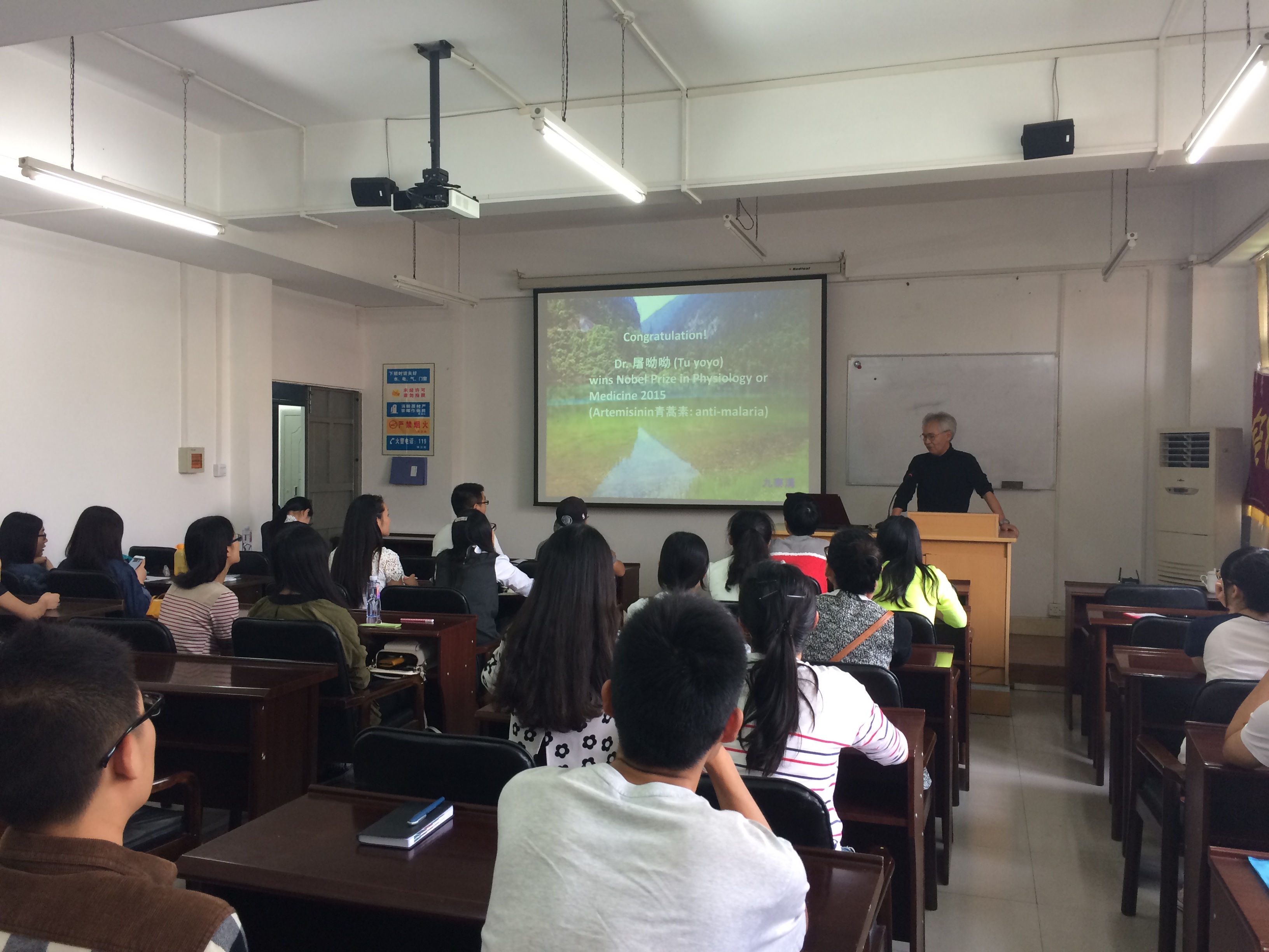 2015年10月14日下午,公司外籍高端东京大学名誉教授山口五十磨,在纺工楼202为师生们作了题为《Safety and Risk Assessments of Agricultural Chemicals》的精彩学术演讲。山口教授的主要研究领域为植物化学,目前已发表学术论文139篇,其中SCI100多篇;著有专著22部;在植物化学领域多次获奖。在整个活动过程中,山口教授结合多年从事植物化学研究的实际经历及丰富实践,耐心细致地为大家讲解农业相关化合物如杀虫剂的安全性评定体系,畅谈了对该领域的真知灼见,并分享视频实例,让大家更形象直观地理解安全性评定方法。演讲深入浅出,充满了丰富的科学前沿知识,赢得师生们阵阵掌声。本次讲座既使得同学们对农药等与农业相关的化合物的安全性评价体系有了更深的了解,也给同学们展示了从事科研工作所具备的求真、务实、严谨的科学态度。