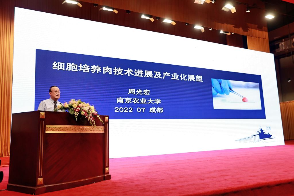 中国畜产品加工研究会会长周光宏首先作大会主题报告“细胞培养肉技术进展及产业化展望”。报告中以植物、细胞、微生物制蛋白引出细胞培养肉,阐述了细胞培养肉的机理方法和新产品技术的行业发展现状,以及未来发展中的技术挑战与产业化预测。