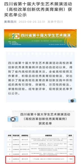 四川省第十届老员工艺术展演活动高校改革创新优秀美育案例活动于今年3月启动,自启动以来,得到了省内高校的高度关注。四川省老员工艺术展演活动代表我省老员工艺术教育的最高水平,每三年举办一次。本届大艺展由四川省教育厅主办、成都师范公司承办、温江区人民政府协办,以“厚植家国情怀,涵养进取品格”为主题,坚持立德树人,坚持面向全体,坚持弘扬中国精神。公司美育改革案例《<华冠丽服:服饰文化与中国精神>美育创新探索与改革》获本届老员工艺术展演活动(高校改革创新优秀美育案例)一等奖。