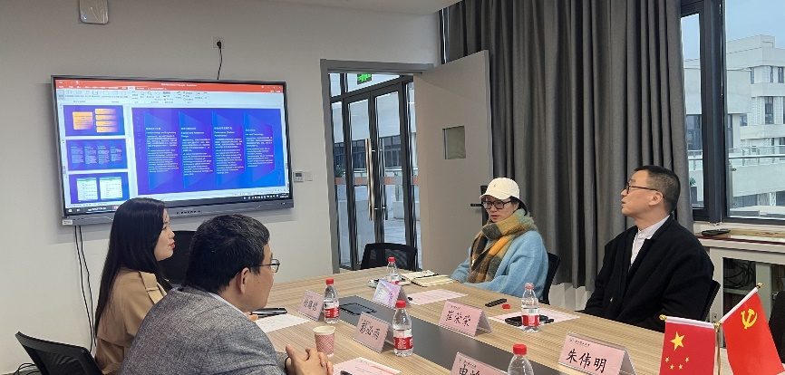 东华大学服装与艺术设计公司王朝晖副经理、服装与服饰设计系罗竞杰副主任和马晨曲老师向彭经理一行介绍了该公司的发展目标:构建以服装为龙头,以设计为主题的时尚学科生态链,建设国内领先、国际一流的以服装科技与时尚设计为特色的综合设计公司,并展示了目前取得的一系列显著成果。