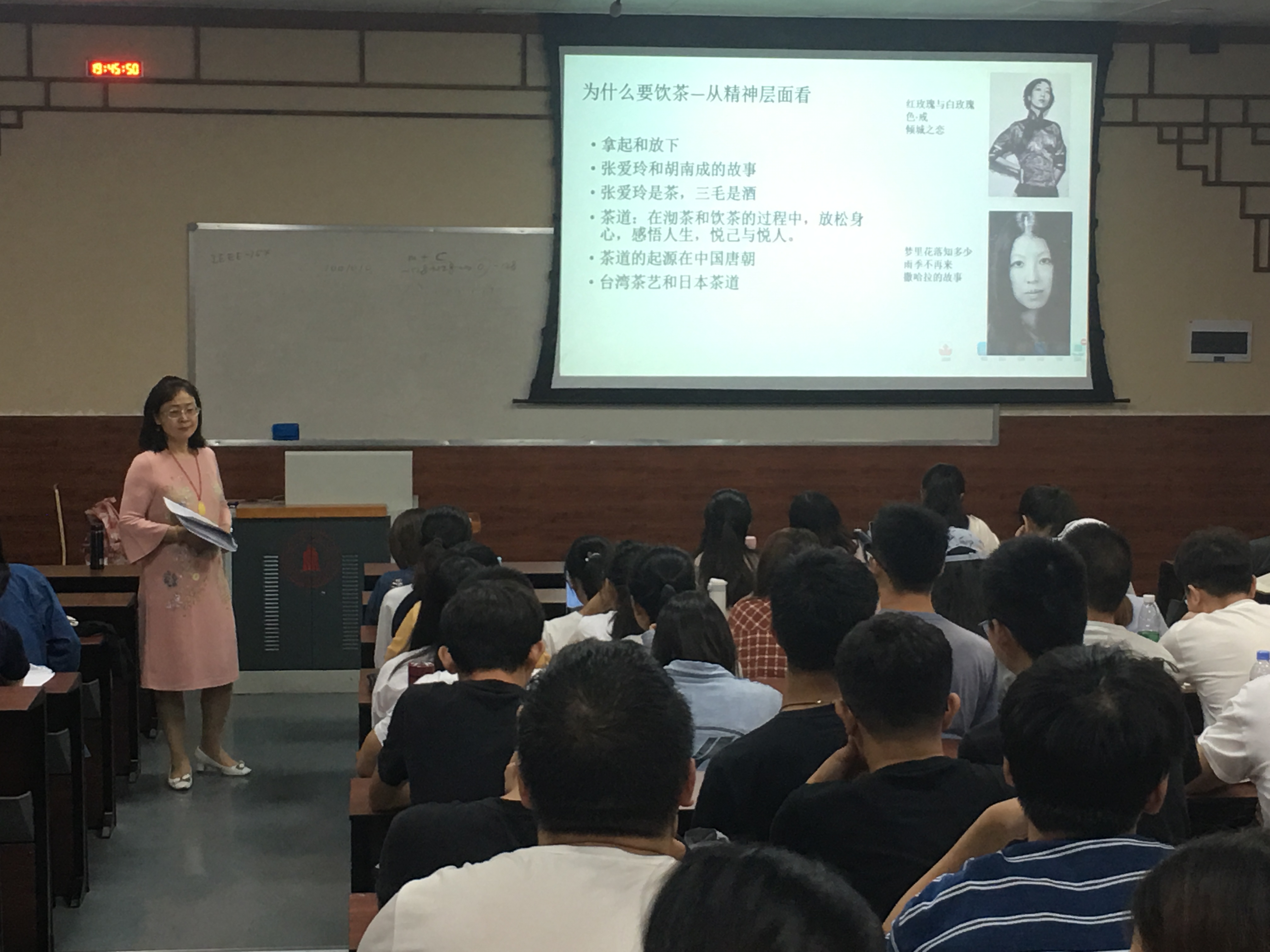 在讨论为什么要饮茶时,贾利蓉教授不仅从物质层面—茶叶与健康的主题入手,从茶的主要成分茶多酚的功能:抗氧化、延缓衰老、抑制心血管疾病、提高人体免疫力、预防和治疗辐射伤害、EGCG可有效阻止艾滋病病毒、减肥功效等,进行了茶的科学介绍。更从精神层面—“拿起”与“放下”的人生哲理进行了详细的阐述。在饮茶时,“拿起”意味着人所承担的责任与担当,“放下”意味着在生活与工作中的一种释然态度。贾利蓉教授还特地以张爱玲与胡南成的故事,分享了自己的心得体会,她形容到“张爱玲是茶,三毛是酒”,张爱玲的人生态度正是饮茶的精神体现。同时,茶道就是在沏茶和饮茶的过程中,放松身心,感悟人生,悦己与悦人。