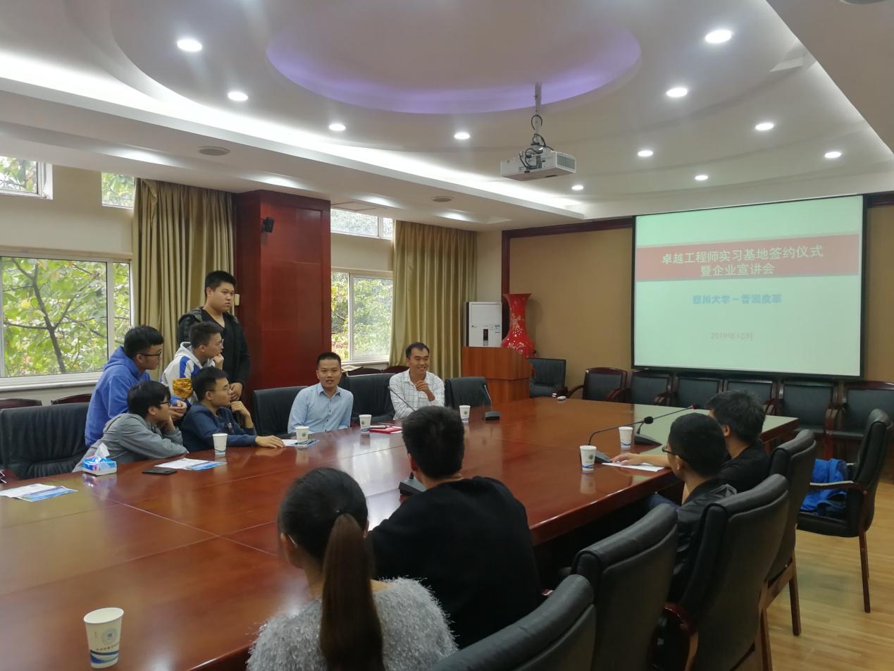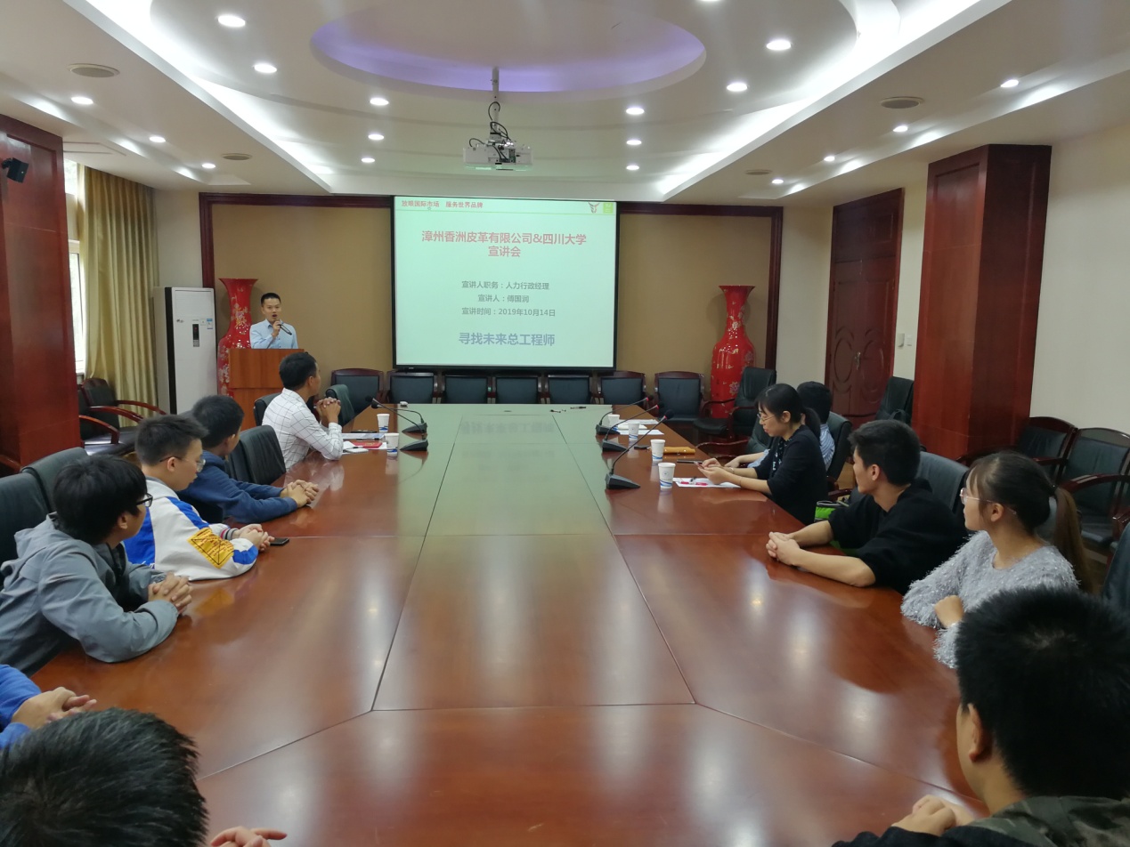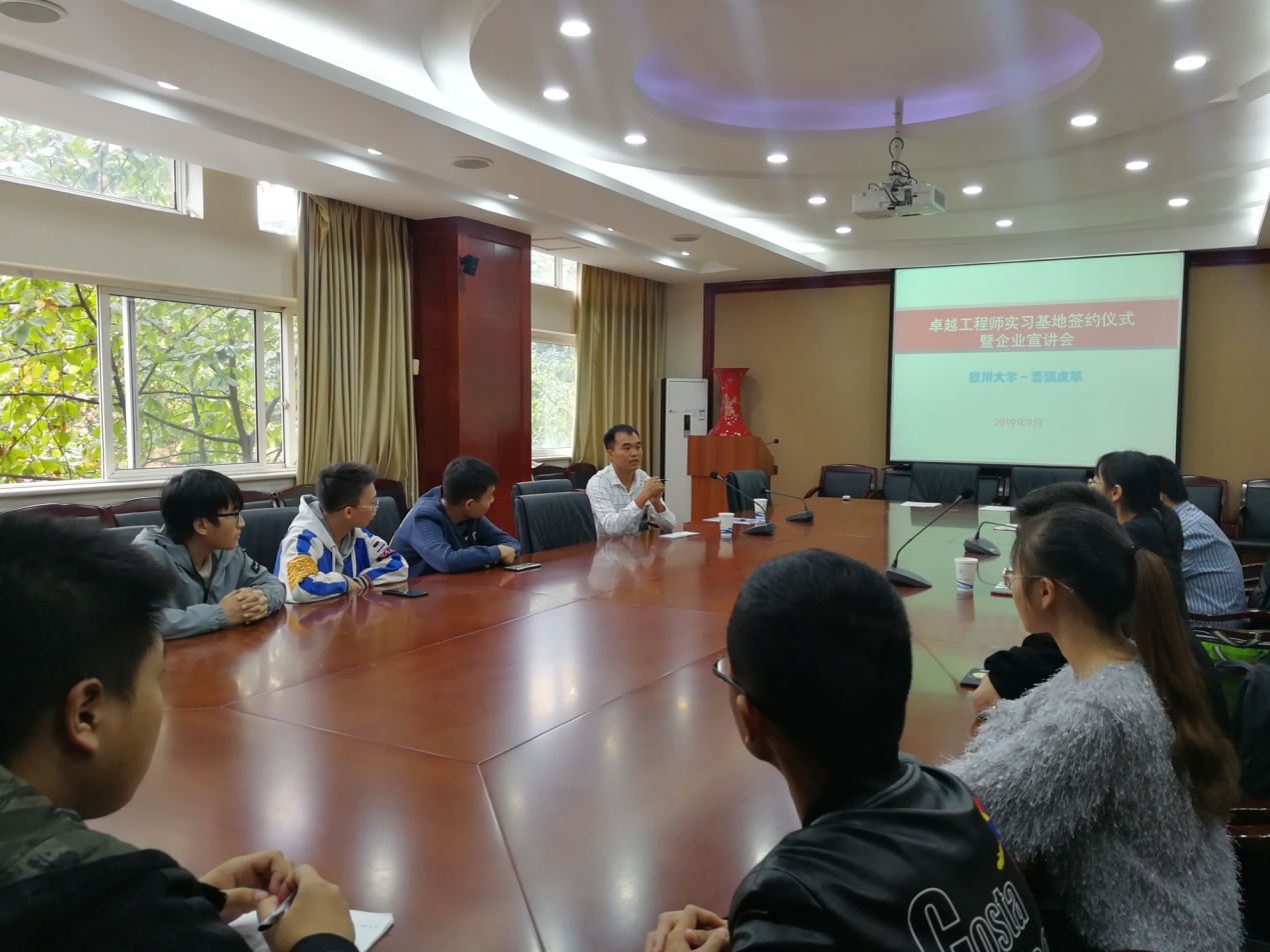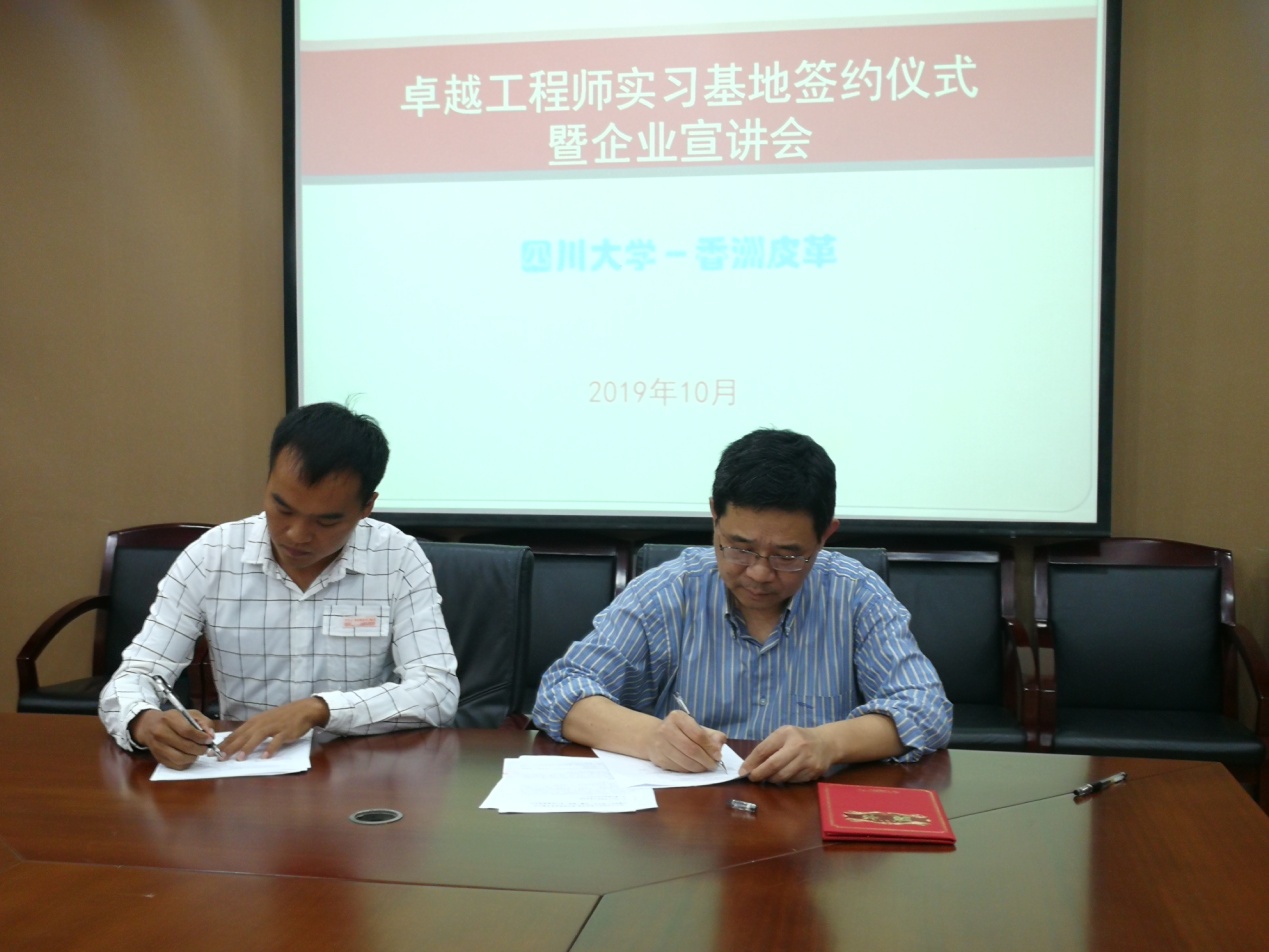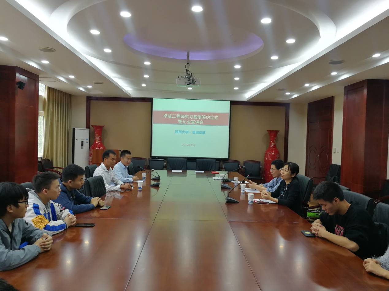 2019年10月14日下午2:30,太阳成集团tyc33455cc与漳洲香洲皮革有限公司“共建卓越工程师实习基地签字仪式暨企业宣讲会” 在皮革楼209会议室顺利举行。太阳成集团tyc33455cc副经理彭必雨教授、生物质与皮革工程系系主任林炜教授、皮革工程教研室主任但年华副教授、漳洲香洲皮革有限公司执行副总林汉彬、人力行政部傅国润经理及2016级本科生出席了本次会议。