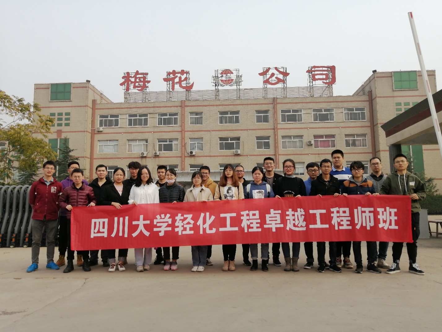 2019年11月6日上午7时50分,同学们准时从住宿地点出发,赶往各自的实习企业进行学习。中午12:00,23名同学与带队老师颜俊、企业导师在梅花制革有限公司门前拍下第一张合影,庆祝本次实习顺利开幕。