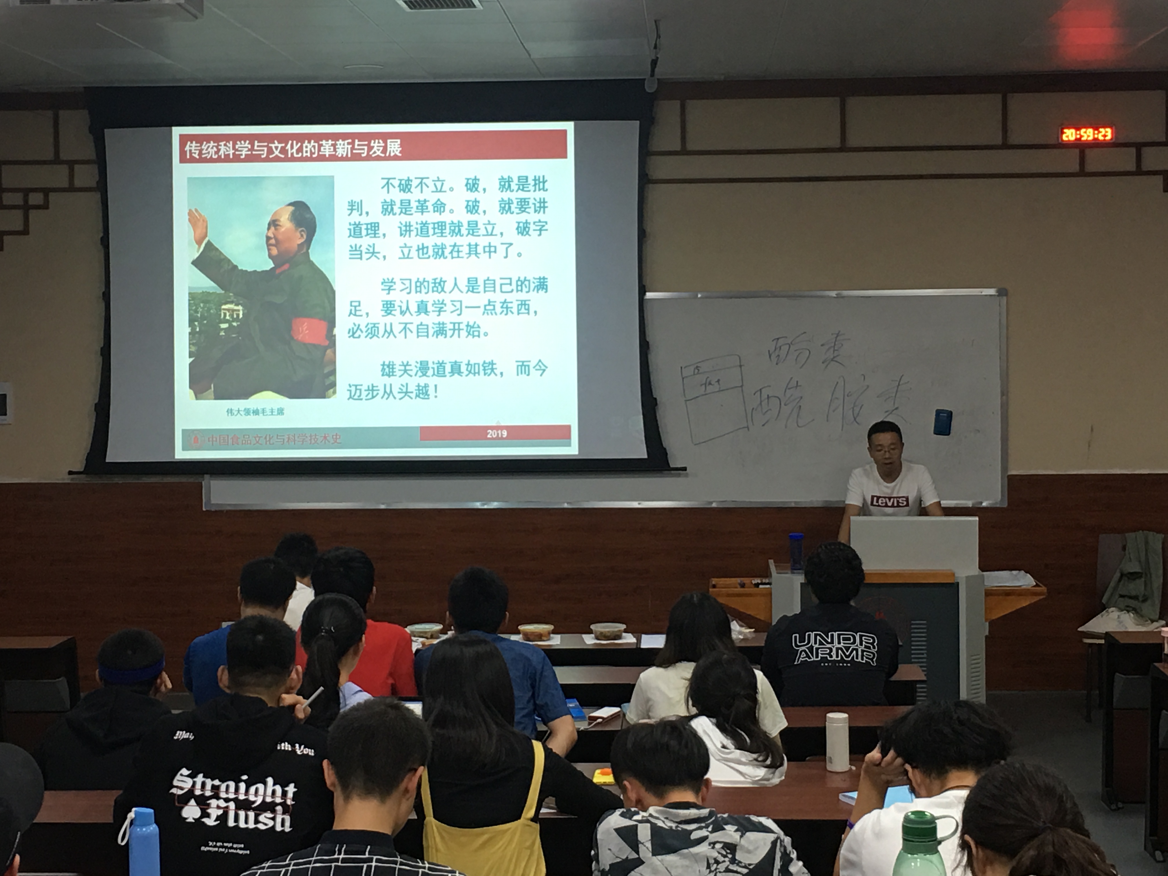 最后,在讲到传统科学与文化的革新与发展中,曾维才副教授引用毛主席在《新民主主义论》中所论述的“不破不立”之观点。破,就是批判,就是革命。破,就是讲道理,讲道理就是立,破字当头,立也就在其中了。传统川菜也正是在创新中浴火重生,从而成为非物质文化遗产,折射出一种四川精神,也体现了一家一味、一味一生、一生一地的思想。课程最后,曾老师还提到学习的敌人是自己的满足,要认真学习一点东西,必须从不自满开始。以此勉励同学们要认真学习传统文化,拓展视野,在传统文化中学习科学文化知识,保持一种积极上进的学习态度。