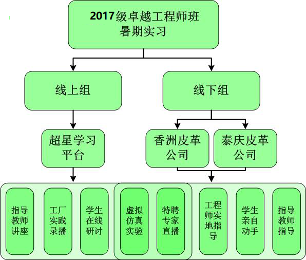 因今年6月北京新发地爆发疫情,原定于河北辛集锚营制革区的实习活动不得不取消,仅保留了福建漳浦皮革工业园的实习计划。根据员工所在区域的疫情风险等级,将41名同学分为“线下组”和“线上组”。“线下组”主要采取传统的导师带队到企业实习的模式进行;“线上组”通过网络讲座、仿真实验等方式开展。两组交叉融合,开启了“线上线下混合实习”的新模式。