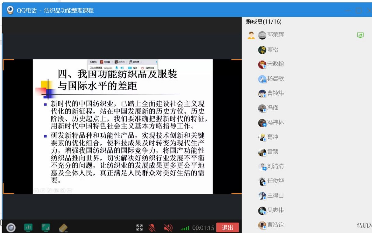 《纺织品功能整理》课程由纺织与服装工程系郭荣辉教授和朱谱新教授两位老师主讲。主讲老师在《绪论》第四部分《我国功能纺织品及服装与国际水平的差距》中加入社会主义现代化建设的内容。新时代的中国纺织业,已踏上全面建设社会主义现代化的新征程,站在中国发展新的历史方位、历史阶段、历史起点上,我们要准确把握新时代的特征,用新时代中国特色社会主义基本方略指导工作。研发新特品种和功能性产品,实现技术创新和关键要素的优化组合,使科技成果及时转变为现代生产力,增强我国纺织品的国际竞争力,将国产功能性纺织品推向世界,切实解决好纺织行业发展不平衡不充分的问题,让纺织业的发展成果更多更公平地惠及全体人民,真正满足人民群众对美好生活的需要。