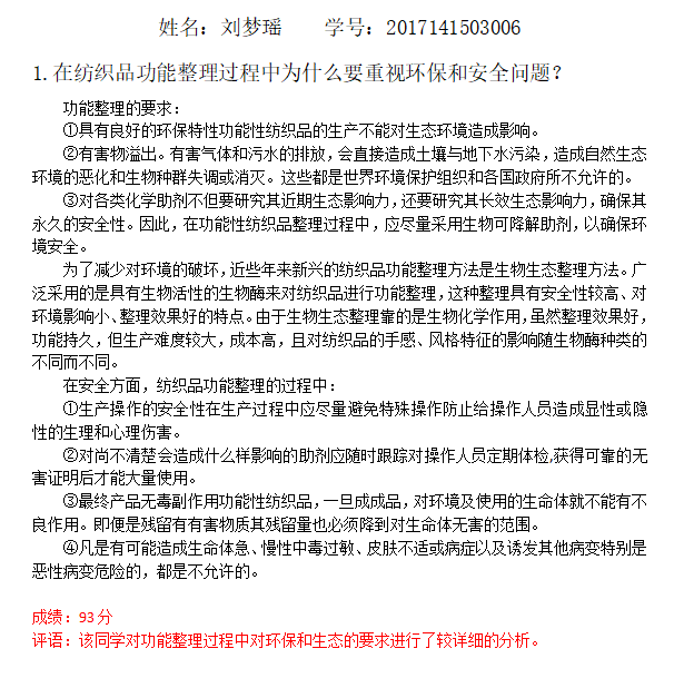 在第三章《抗静电纤维及纺织品》的课后思考题中,主讲老师加入了人与自然的和谐发展理念的内容。课后思考题为“请思考在纺织品功能加工中为什么要重视环保和安全问题?”社会主义生态文明观,是我们党在国家经济发展进入新常态、全面建成小康社会进入决胜阶段的伟大历史进程中,我们党围绕如何认识生态文明、如何建设生态文明,逐步形成的一系列新理念新思想新战略。纺织品功能加工中必须重视环保和安全问题,这是纺织品生产行业特别需要注意的方面。在课后思考题中加入这一内容,引导员工在学习专业知识的基础上,有意识地关注和重视环保和安全问题,把人与自然和谐发展的社会主义生态文明观应用于生产实际中,加强员工的生态保护意识。