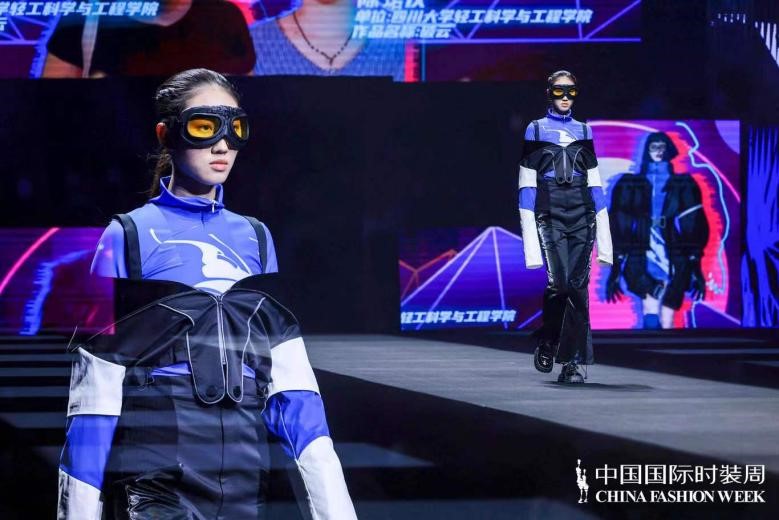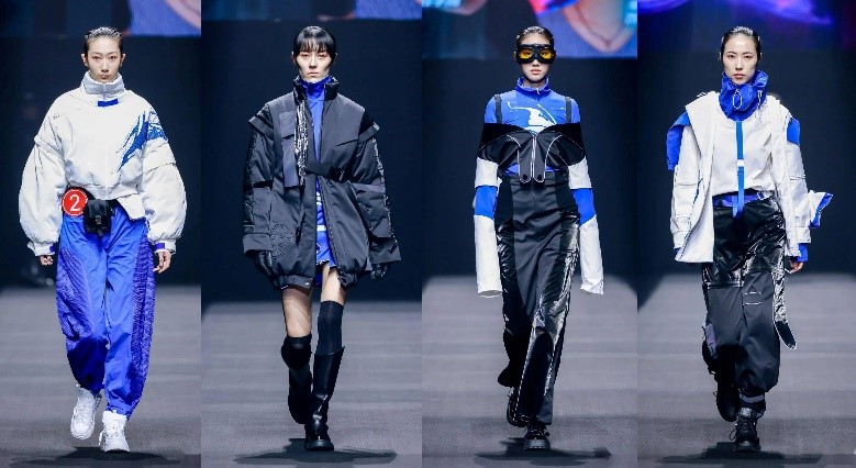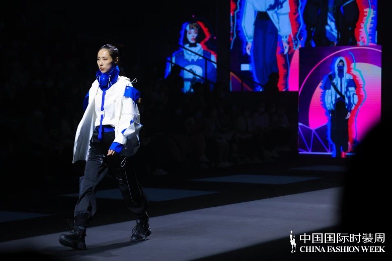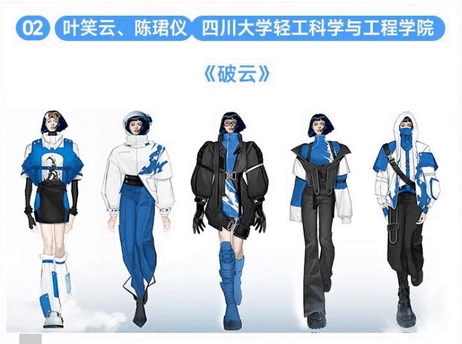“须知少时凌云志,曾许人间第一流”,叶笑云、陈珺仪二人的作品灵感迸发于当代青年志冲云霄的雄心与勇气。整体设计以机能工装风为基调,以黑、白、蓝、灰为主色,将户外运动性与时尚潮流相结合。在服装结构和工艺细节上,同时加入了中国传统元素风格设计的航天图案,呼应主题。这种将传统设计与现代时尚融合碰撞的创新结合也得到了评委们的一致好评。