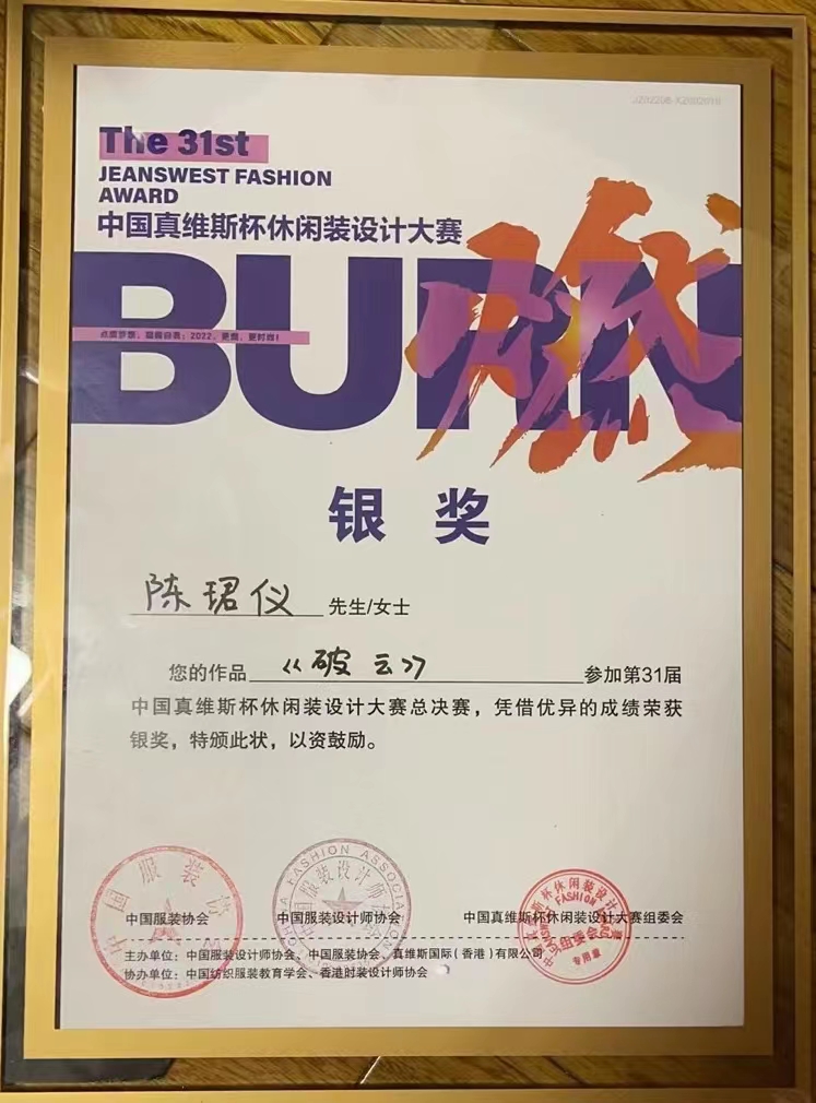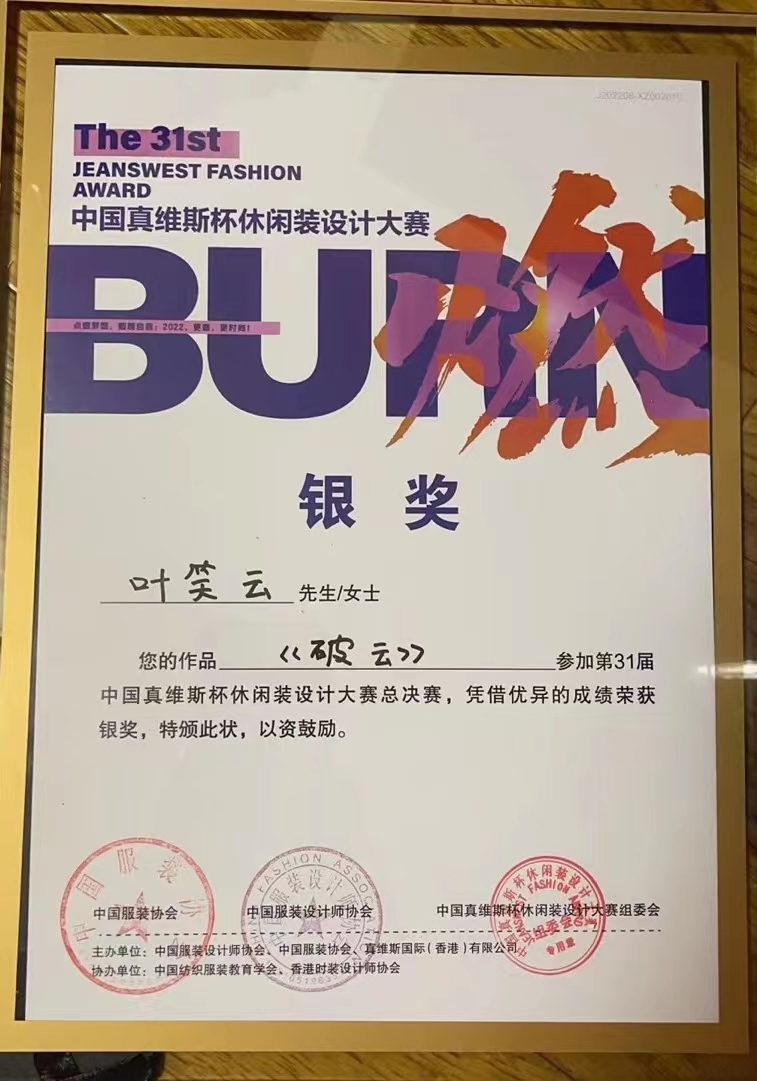 本届赛事以“燃”为主题,借“燃”之力,呼唤新时代服装人,用设计的力量点燃青春,奋斗青春,不负韶华。大赛由中国服装设计师协会、中国服装协会、真维斯国际(香港)有限公司联合主办,中国纺织服装教育学会、香港时装设计师协会和if时尚等多家单位共同协办。自启动以来,受到全国各地院校师生的关注,最终收到千余份投稿作品。历经效果图初评、现场答辩、总决赛动态展演等专业评审团多轮严格评分,叶笑云、陈珺仪二人作品最终喜获大赛银奖,创下公司学子历届参加该大赛成绩新高。