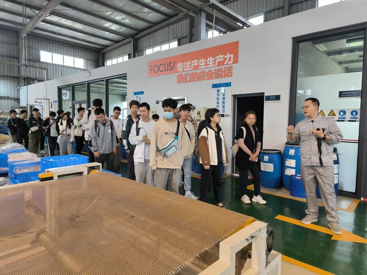 为加强2023级本科生职业生涯规划与专业教育指导,2023年11月4日,公司组织2023级工科试验班(先进低碳材料)专业开展了“共话皮革梦 走进德赛尔”为主题的专业认知实习活动。在公司经理彭必雨教授、公司党委冯国涛副书记、2023级班主任代表张旭老师,辅导员王舒灏老师、余昕玲老师、李有真老师的组织带领下,2023级工科试验班(先进低碳材料专业)本科生以及部分高年级同学一行赴四川德赛尔新材料科技有限公司进行交流学习。