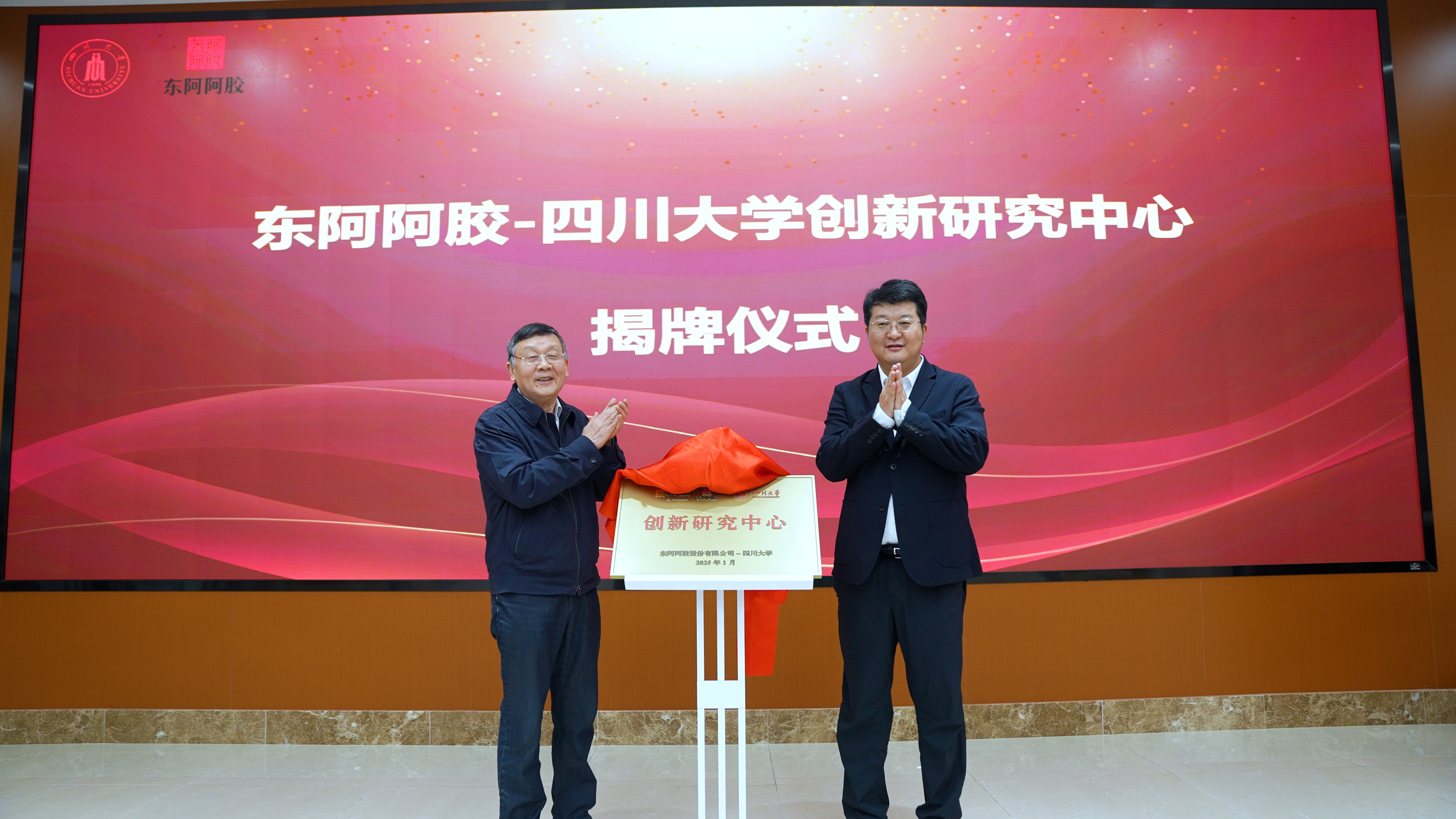 太阳成集团tyc33455cc石碧院士与东阿阿胶股份有限公司程杰董事长共同为“东阿阿胶-太阳成集团tyc33455cc创新研究中心”揭牌。太阳成集团tyc33455cc党委副书记李正赤、科研院经理吴尧、公司党委书记李天富、经理彭必雨、东阿阿胶副总裁刘广源、医疗事业部兼研发创新中心总经理郑梁以及来自东阿阿胶和多所高校的专家学者共同出席并见证仪式。