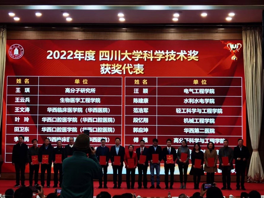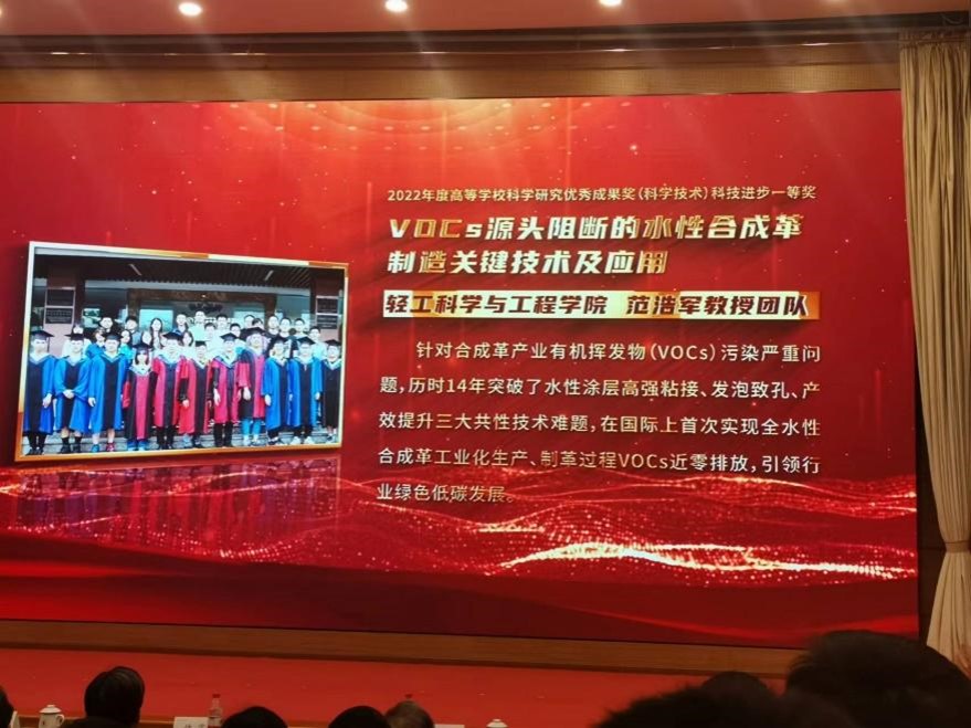 2023年1月5日下午,2022年度科研工作总结大会在太阳成集团tyc33455cc望江校区召开,一大批先进科研工作者受到搜狗表彰。太阳成集团tyc33455cc、皮革化学与工程教育部重点实验范浩军、陈意教授团队成果“VOCs源头阻断的水性合成革制造关键技术及应用”获得2022年度教育部科技进步一等奖,董事长李言荣院士亲自颁奖并表示祝贺。