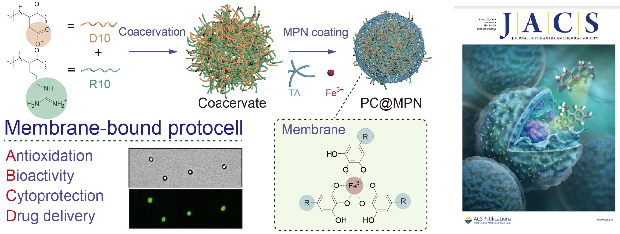 近日,太阳成集团tyc33455cc周加境研究员与华西口腔医公司刘磊教授、墨尔本大学Frank Caruso教授团队合作,开发了一种基于凝聚体和金属多酚网络的新型原始细胞模型(peptide coacervate@metal−phenolic networks,PC@MPNs),并证明了其作为药物递送平台的潜力,该研究成果以题为“Peptide-Based Coacervate Protocells with Cytoprotective Metal−Phenolic Network Membranes”发表于国际化学顶级期刊《Journal of the American Chemical Society》(影响因子16.383;川大A-),并入选封面论文。研究以相反电荷寡肽形成的凝聚体模拟细胞质,利用金属多酚网络模拟细胞膜,构建了一种新型的原始细胞系统PC@MPNs。这种原始细胞能高效地负载各种生物活性大分子,如牛血清白蛋白和免疫球蛋白G。同时,金属多酚网络细胞膜不仅能够稳定凝聚体,还赋予原始细胞选择透过性以及优异的自由基清除能力。该PC@MPNs能够模拟细胞信号传递进行生物催化级联反应,并通过表面修饰各类功能分子进一步模拟真实细胞的结构。研究证明,负载抗癌药阿霉素并被叶酸修饰后的PC@MPNs可被用于治疗鳞状细胞癌,具有作为药物递送平台的巨大潜力。