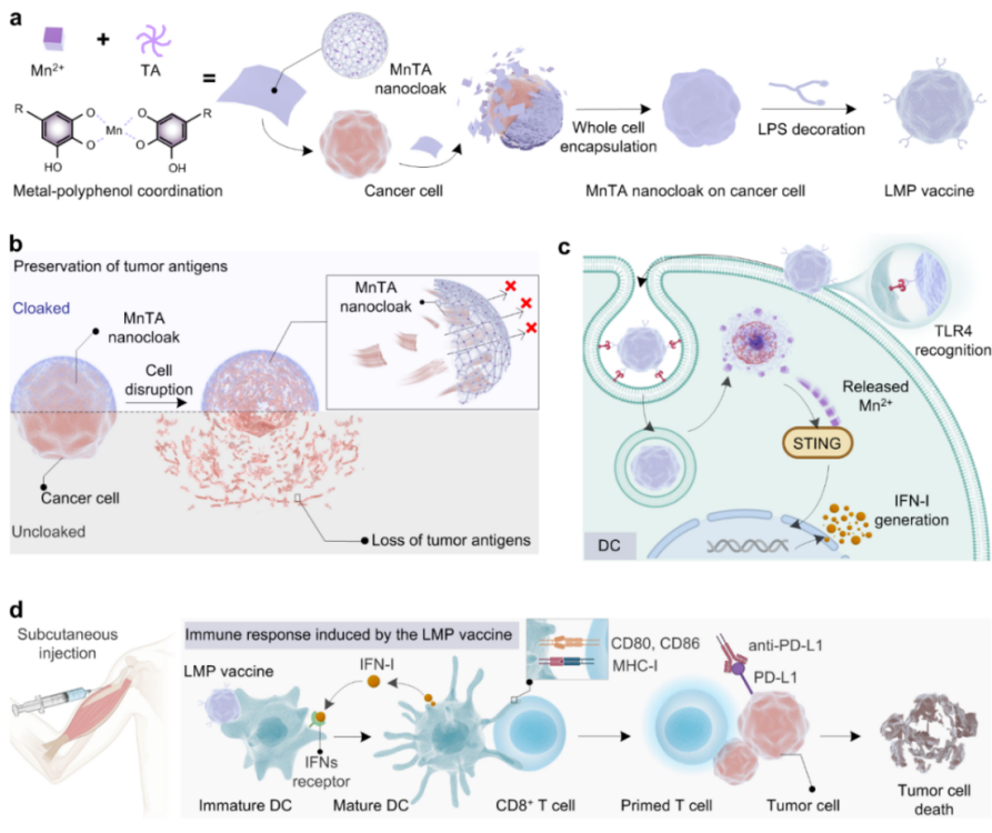 公司郭俊凌教授团队长期围绕植物多酚在基础科学和前沿应用领域开展研究,发展了面向跨领域应用的植物多酚基功能材料体系(Science 2018, Sci. Adv. 2021; Nat. Nanotechnol. 2016, Nat. Commun. 2022; Matter 2023; Angew. Chem. 2014, Angew. Chem. 2019, Angew. Chem. 2023, , Angew. Chem. 2024; Adv. Mater. 2013, Adv. Mater. 2020; Adv. Mater. 2023; Appl. Phys. Rev. 2022; Chem. Soc. Rev. 2022; Energy Environ. Sci. 2019; EES Catalysis 2024; Environ. Sci. Technol. 2023; ACS Nano 2023; Chem. Mater. 2023等)。近日,该团队开发了一种由金属多酚纳米涂层包裹肿瘤细胞的策略,并进一步用细菌脂多糖(LPS)进行表面修饰作为疫苗佐剂,构建了全细胞疫苗,称为LMP vaccine(图1)。研究构建了植物多酚单细胞涂层,保存了被包裹肿瘤细胞所有的新癌抗原。在被树突状细胞摄取后,LMP vaccine在树突状细胞内部释放锰离子和肿瘤抗原组分刺激先天免疫通路STING,与肿瘤抗原协同促进了树突状细胞的成熟,并进一步将肿瘤抗原信号呈递给T细胞,从而实现了增强的抗肿瘤免疫反应,抑制了肿瘤的生长。该研究成果以“Metal-Phenolic Nanocloaks on Cancer Cells Potentiate STING Pathway Activation for Synergistic Cancer Immunotherapy”为题发表于国际化学顶级期刊Angewandte Chemie International Edition,并被选为“Hot Paper”,文章的通讯作者为郭俊凌教授和何云翔副研究员(专职科研),第一作者为2020级硕士研究生和向莲。香港中文老员工物医学公司副经理、逸夫书院董事Wood Yee Chan教授对该研究提出了宝贵建议。