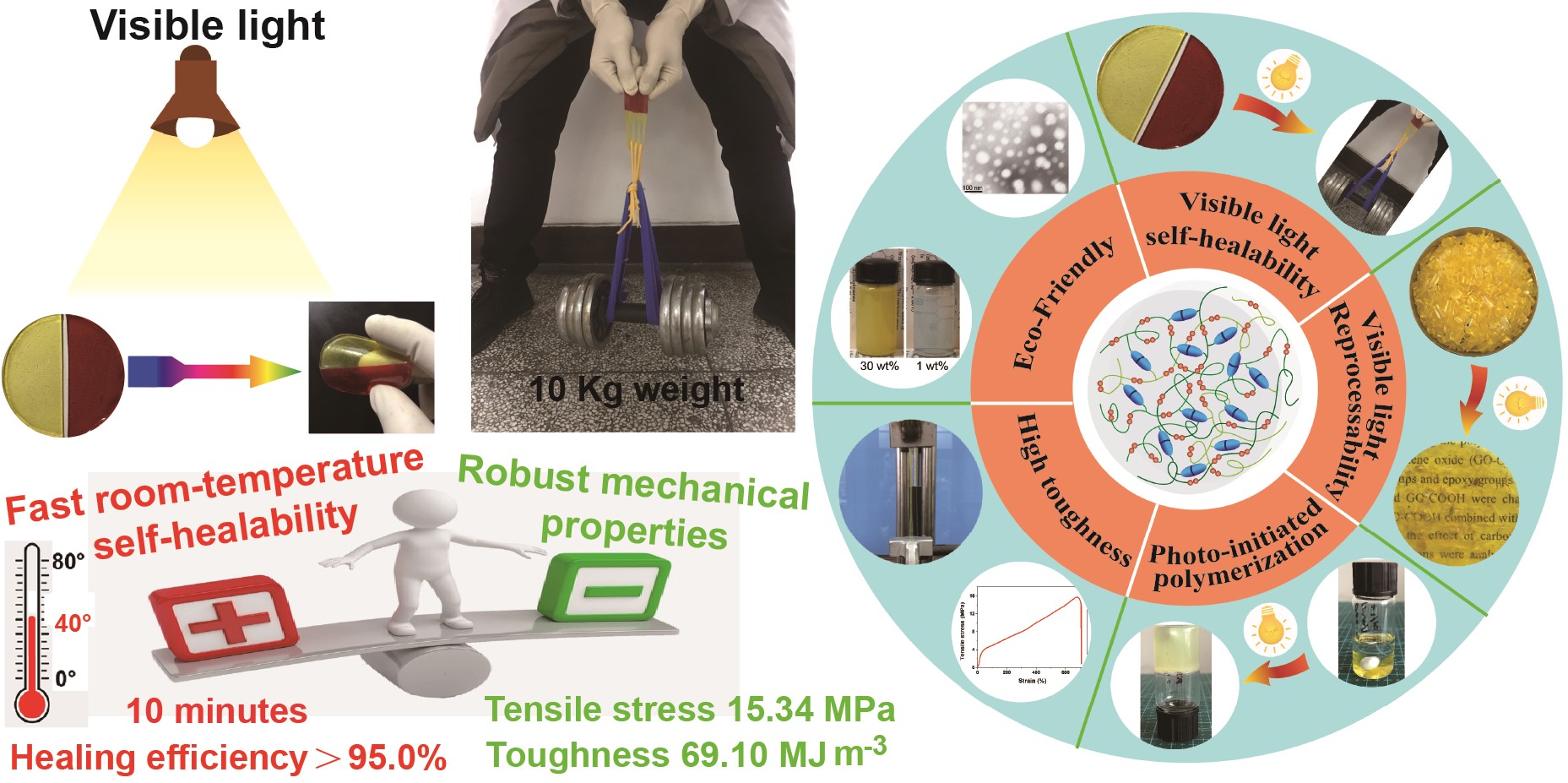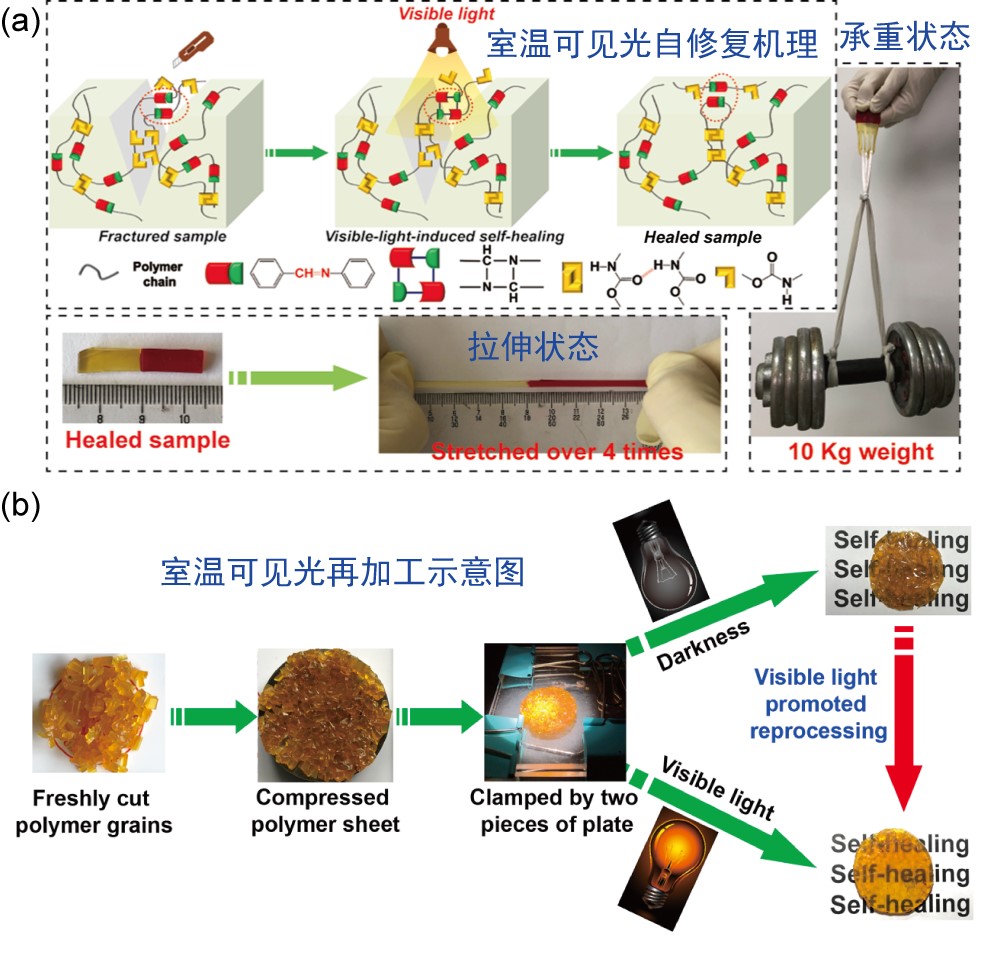 自修复高分子材料的开发能够提高合成高分子材料的可靠性、耐久性和服用周期,在可穿戴电子皮肤、人工肌肉、柔性电子器件、锂离子电池、组织工程和涂料等领域具有广泛的应用。自修复高分子材料室温化和快速化修复及其力学高性能化和水性化是其当前的重要发展趋势,但目前已报道的自修复高分子材料在兼具快速室温自修复性能与高力学性能方面仍需进一步提高,同时其环保性也是亟待解决的问题。光修复具有简单易得、来源广泛、可操控性强和可远程定点投送等优点,可通过光或光热转化来诱发动态化学键的可逆反应,进而实现高分子材料的自修复。其中,可见光修复由于不存在紫外光修复时高分子的潜在降解问题,也不存在红外光修复时的显著光热效应,有望成为一种更有前景的室温修复方式。