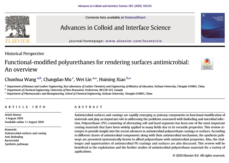 近期,公司林炜教授课题组对该领域的研究进行总结并提出前瞻性展望,在国际重要期刊《Advances in Colloid and Interface Science》上发表了题为“Functional-modified polyurethanes for rendering surfaces antimicrobial: an overview”的综述文章。论文的第一作者为公司专职博士后王春华,主要从事新型抗菌聚氨酯涂层的设计合成与应用研究。