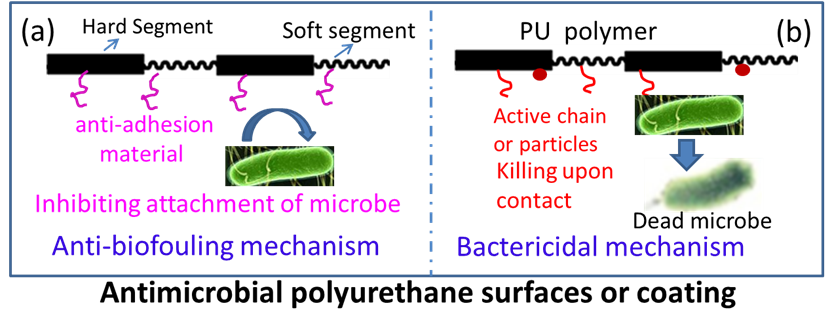 图1抗菌聚氨酯涂层的两大抗菌机制示意图:(a)杀菌; (b)抗菌吸附