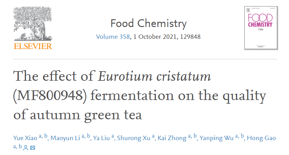 近日,公司高鸿教授团队以秋茶为原料,利用专利菌株“冠突散囊菌PW-1”进行秋茶发酵,探究冠突散囊菌PW-1菌株对黑茶品质的提升作用及机制,相关研究成果以公司为第一单位发表在食品科技领域顶级期刊《Food Chemistry》上,题为“The effect of Eurotium cristatum (MF800948) fermentation on the quality of autumn green tea”。公司博士研究生肖月为第一作者,高鸿教授为通讯作者,该项目获得了四川省科技计划项目基金(No. 20ZDYF3186)的支持。