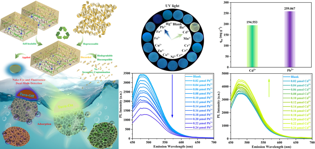 研究团队通过精心的设计,利用甲基丙烯酸缩水甘油酯对课题组先前所报道过的石墨烯量子点进行了功能化修饰以利于其能够稳定地共价交联固定到凝胶基材中,并通过合理的选择生物质明胶和生物源硫辛酸作为双重网络构建了如上图所述的凝胶材料。该凝胶在吸附镉离子/铅离子后,石墨烯量子点的荧光会出现相应的增强/猝灭,而明胶的荧光却不会发生明显的改变,致使凝胶在吸附镉离子/铅离子后会呈现出青色至黄绿色/蓝紫色的荧光颜色转变并伴随明显的荧光强度变化,从而首次实现了同时灵敏裸眼/荧光双模式检测镉离子和铅离子,对镉离子和铅离子的检测线性范围可控制在0.02-0.24 μmoL之间。同时,由于含有大量的活性吸附位点,该凝胶还能够有效的吸附水中的镉离子和铅离子,最大吸附容量分别可达194.553和259.067 mg/g,均超过了先前报道的凝胶吸附材料。此外,该凝胶具有优异的自愈能力、可再加工性、生物降解性和生物相容性,在实际应用中可延长其使用寿命并可防止其在弃用时造成二次污染。本研究不仅为同时灵敏检测和有效去除水中的镉离子和铅离子开发了一个多功能平台,而且为未来研究制备用于监测和净化重金属污染水的多功能材料提供了一种创新性设计策略。