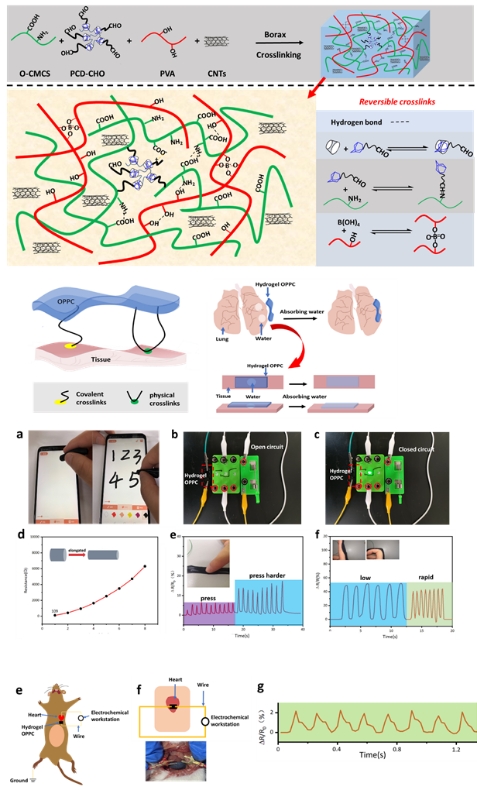 该团队后续又以羧甲基壳聚糖和β-环糊精等为基材,碳纳米管(CNTs)为填充物和主要导电物质制备了双网络水凝胶(硼酸酯键和Schiff base交联)。该水凝胶具有快速的自愈性、极高的自愈率(99%)、良好的机械性能及拉伸性、良好的细胞相容性和较高的灵敏性。此外,该水凝胶具有超高吸水率,可快速吸收湿组织表面的水分膨胀从而与组织形成良好的黏附作用。该双网络水凝胶通过组装成柔性传感器后除了用于监测人体的宏观运动外,还能很精确地贴附在小白鼠心脏(体内)监测其跳动(图3)。相关研究成果以公司为第一单位发表在《Carbohydrate Polymers》上,题为“Rapid self-healing and self-adhesive chitosan-based hydrogels by host-guest interaction and dynamic covalent bond as flexible sensor”。公司硕士研究生任志军为本文第一作者,其导师辜海彬副教授为通讯作者。该项研究得到了国家自然科学基金的资助。