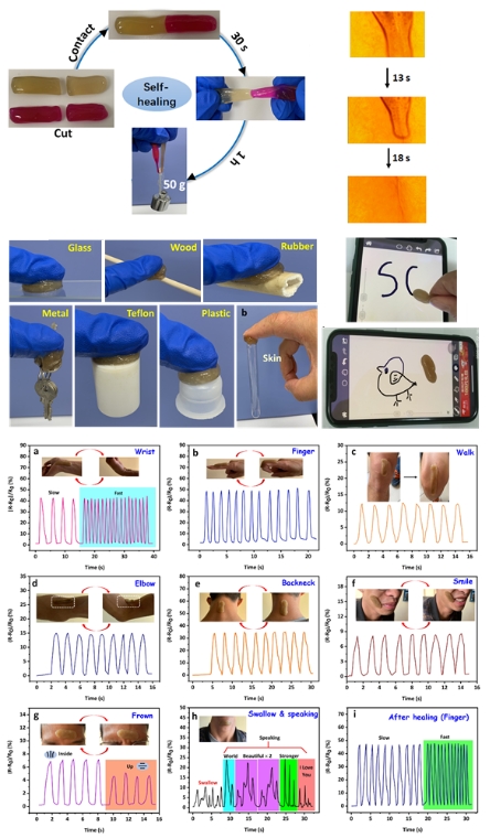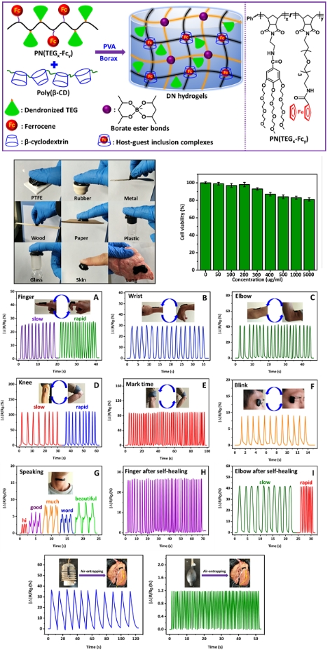 该研究团队以明胶、β-环糊精和PVA等为原料制备了双网络(主-客体作用和硼酸酯键)的水凝胶柔性传感器。该水凝胶传感器表现出更好地机械性能和更高的自愈率(>95%),以及较好的应变敏感性,除了能监测人体的运动外,还能监测体外模拟的猪肺呼吸情况(图2)。相关研究成果以公司为第一单位发表在《ACS Applied Materials & Interfaces》上,题为“Multifunctional Self-Healing Dual Network Hydrogels Constructed via Host−Guest Interaction and Dynamic Covalent Bond as Wearable Strain Sensors for Monitoring Human and Organ Motions”。公司博士研究生刘雄为本文第一作者,其导师辜海彬副教授为通讯作者。该项研究得到了国家自然科学基金的资助。