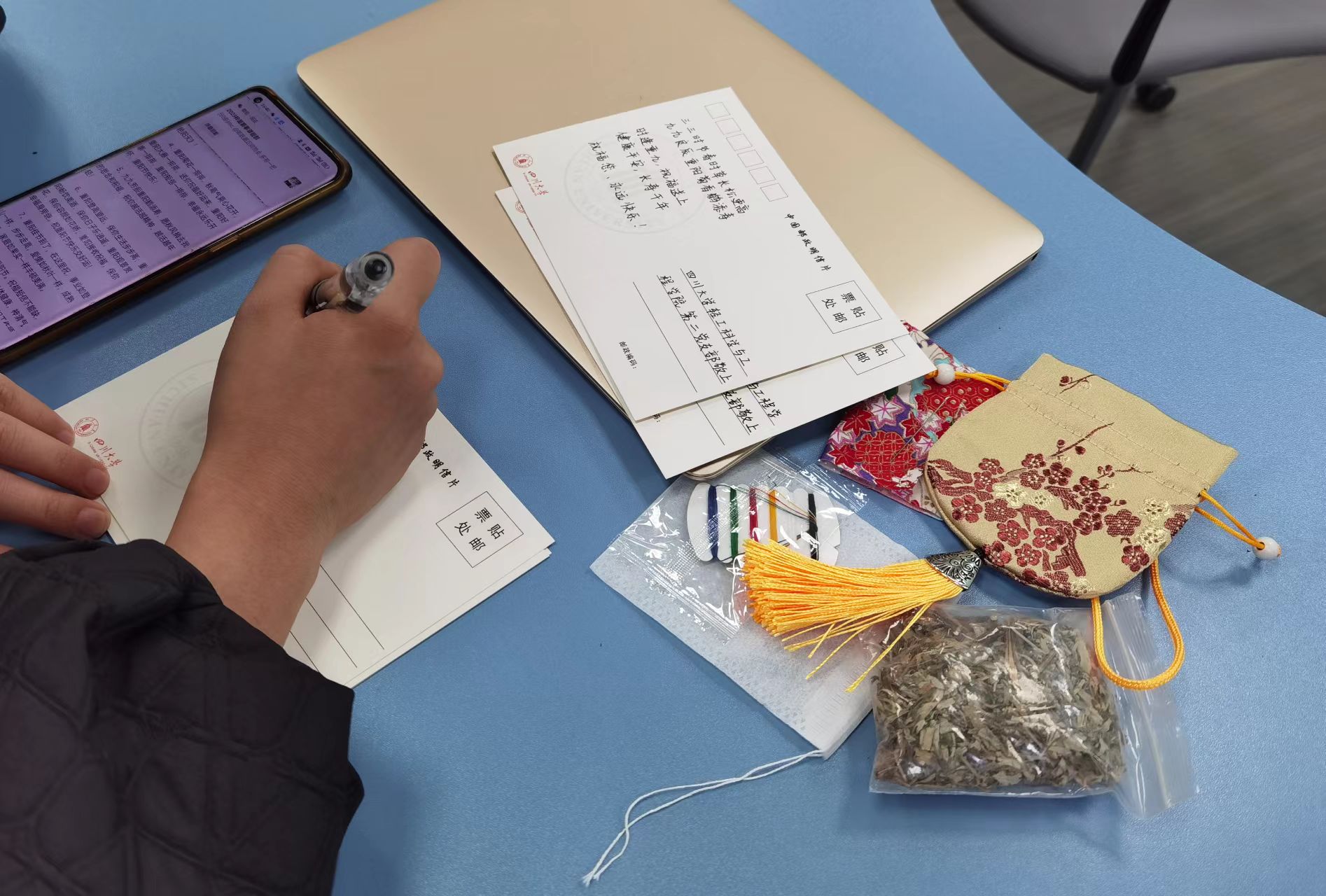 同时,本科生第二党支部在重阳节之际,为了践行“尊老、敬老、爱老、助老”的社会风尚,组织党员同志为公司离退休党支部成员制作香囊。大家围坐在一起互帮互助,耐心细致地缝制香囊。小小香囊,一针一线拼接缝制,内部填入各种香料,寄托着对老同志的浓浓祝福。最后,同志们以书写明信片的方式,用文字寄托情感,用信件为送去佳节问候。