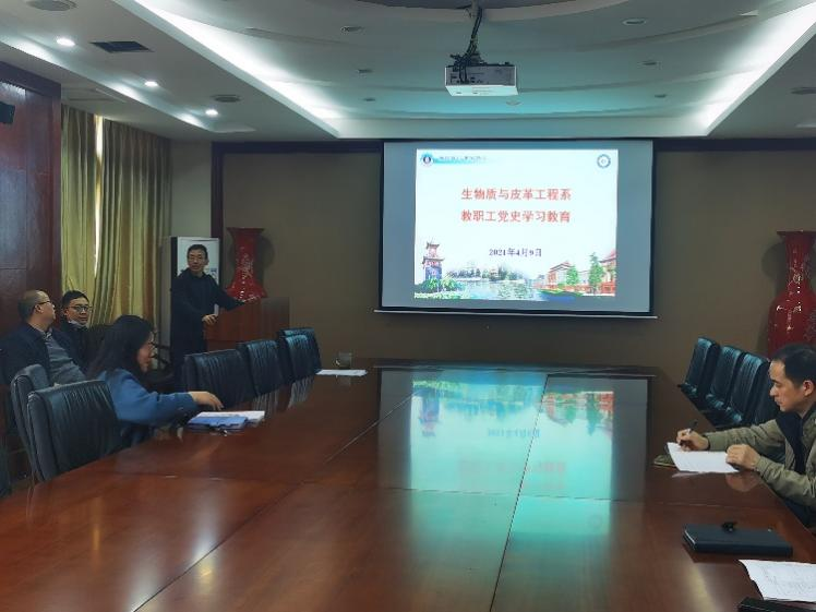 2021年4月9日下午,生物质与皮革工程系全体教职工在皮革楼209会议室开展了党史学习教育专题活动。