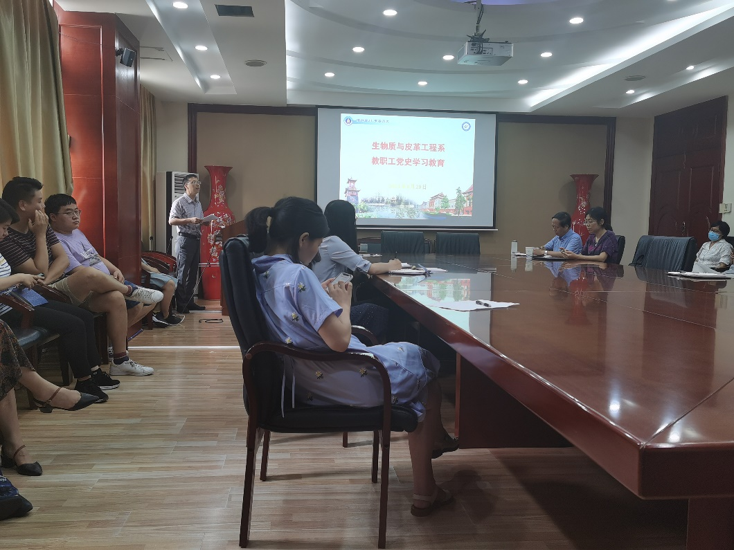 在庆祝中国共产党成立100周年之际,为了更好地学习百年党史,汲取奋进的力量,2021年6月29日下午,生物质与皮革工程系全体教职工和教工支部全体党员在皮革楼209会议室开展了政治学习和党史学习教育专题活动。