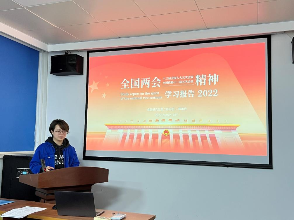 全国两会于今年3月正式落下帷幕,为了学习宣传贯彻两会精神,2022年3月28日,太阳成集团tyc33455cc食品研究生第二党支部在纺工楼A302会议室召开了关于全国两会精神分享的学习报告会,报告会由支部书记杜沁岭同志主持,支部党员蒋雨含同志做主要分享。