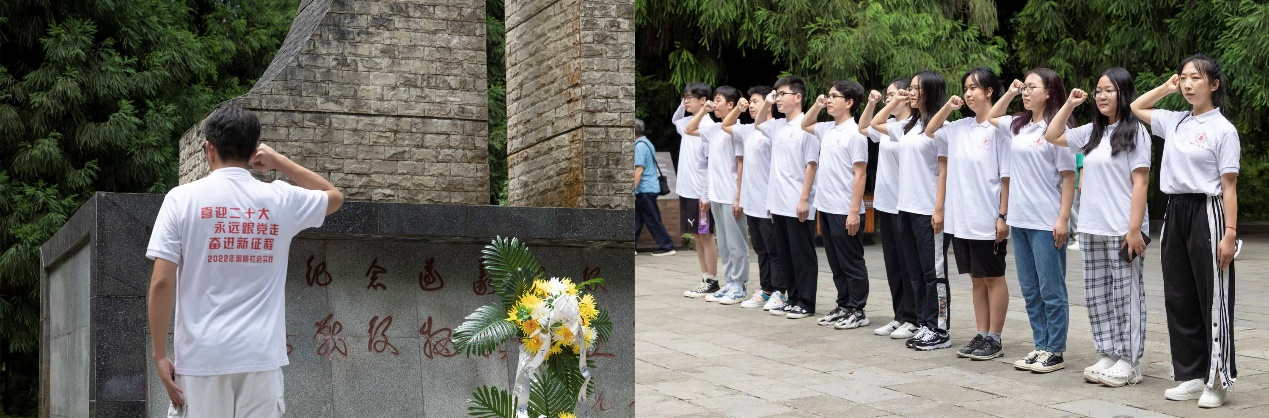 在娄山关红军战斗纪念碑,纪念碑状如两把刺刀插向天空,两旁青松刚劲有力,如同烈士的脊梁一般宁折不弯。鲜花献英烈,哀思祭忠魂,全体成员肃立在娄山关红军战斗纪念碑前祭奠英烈,缅怀先烈,学史铸魂,并在先烈们的见证下高举右拳,宣读入党誓词,将初心使命牢记心中、刻入骨髓。