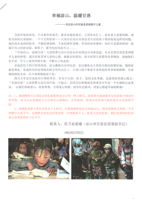 公司工会与凉山甘洛县团委共同开展“幸福凉山,温暖甘洛”儿童圆梦公益行动,希望通过我们的关爱,让甘洛县贫困留守儿童感受到社会的关爱。也许我们小小的奉献,会成为他们最珍视的礼物,为他们营造一个良好的学习生活环境,让他们在社会这个大家庭里健康快乐成长。首次活动安排如下: