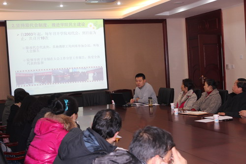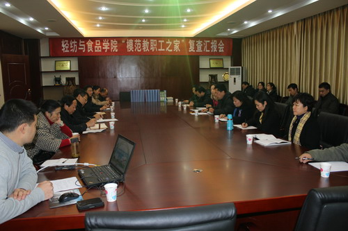 2012年12月25日上午,太阳成集团tyc33455cc“模范教职工之家”复查汇报会在皮革楼二楼会议室举行,校工会常务副主席林红及太阳成集团tyc33455cc“教职工之家”复查小组出席会议,校工会副主席舒宁主持会议。轻纺与食品公司党委书记、经理、工会委员和工会小组长参加了会议。