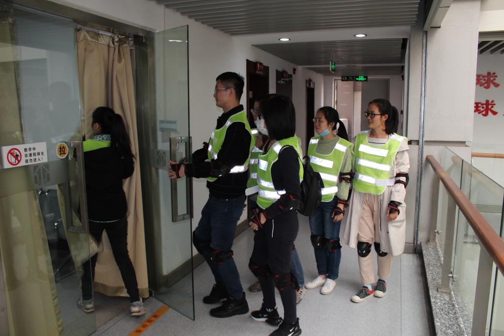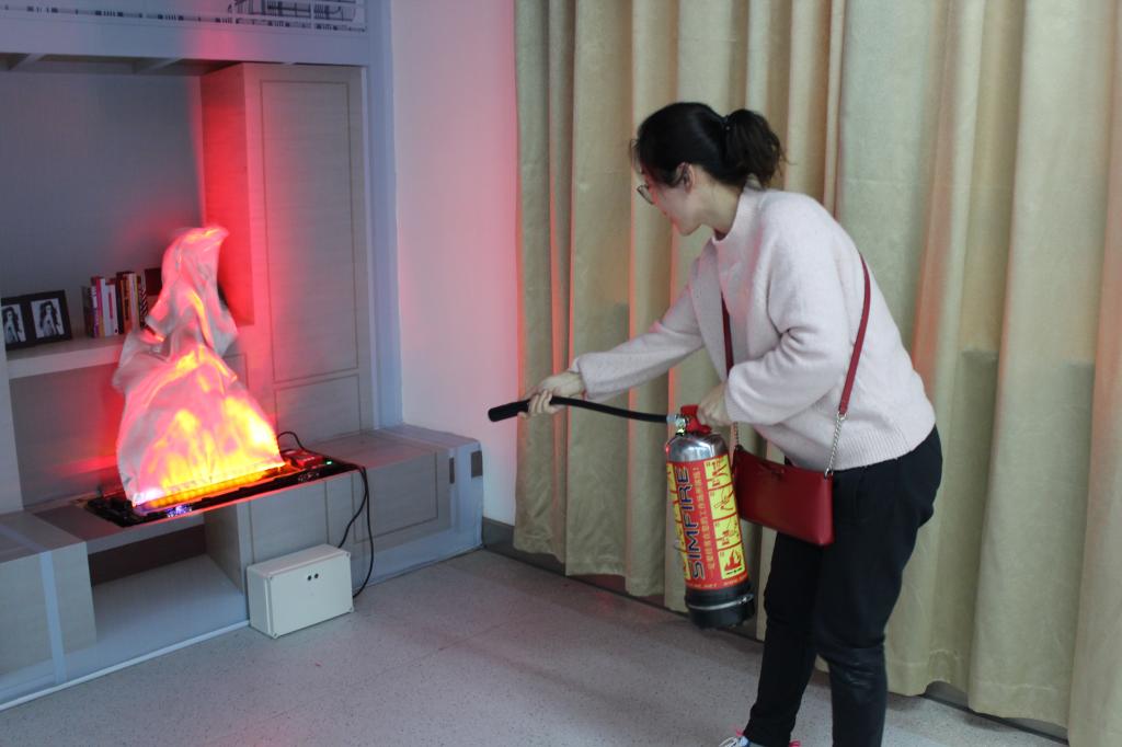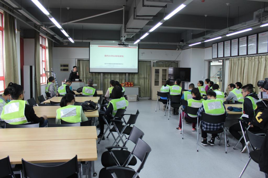 第一阶段的培训主要解决火灾是否有扑救的可能,在保证自身安全的前提下有效扑救;无法扑救时,应选择尽快逃生,并报警。第二阶段主要解决如何安全逃生的问题,安全指示牌的作用,出口的快速寻找,湿毛巾、呼吸面具的使用,低姿逃生,手背试温等知识;参加培训的老师相互协助体验了“模拟逃生”的过程。