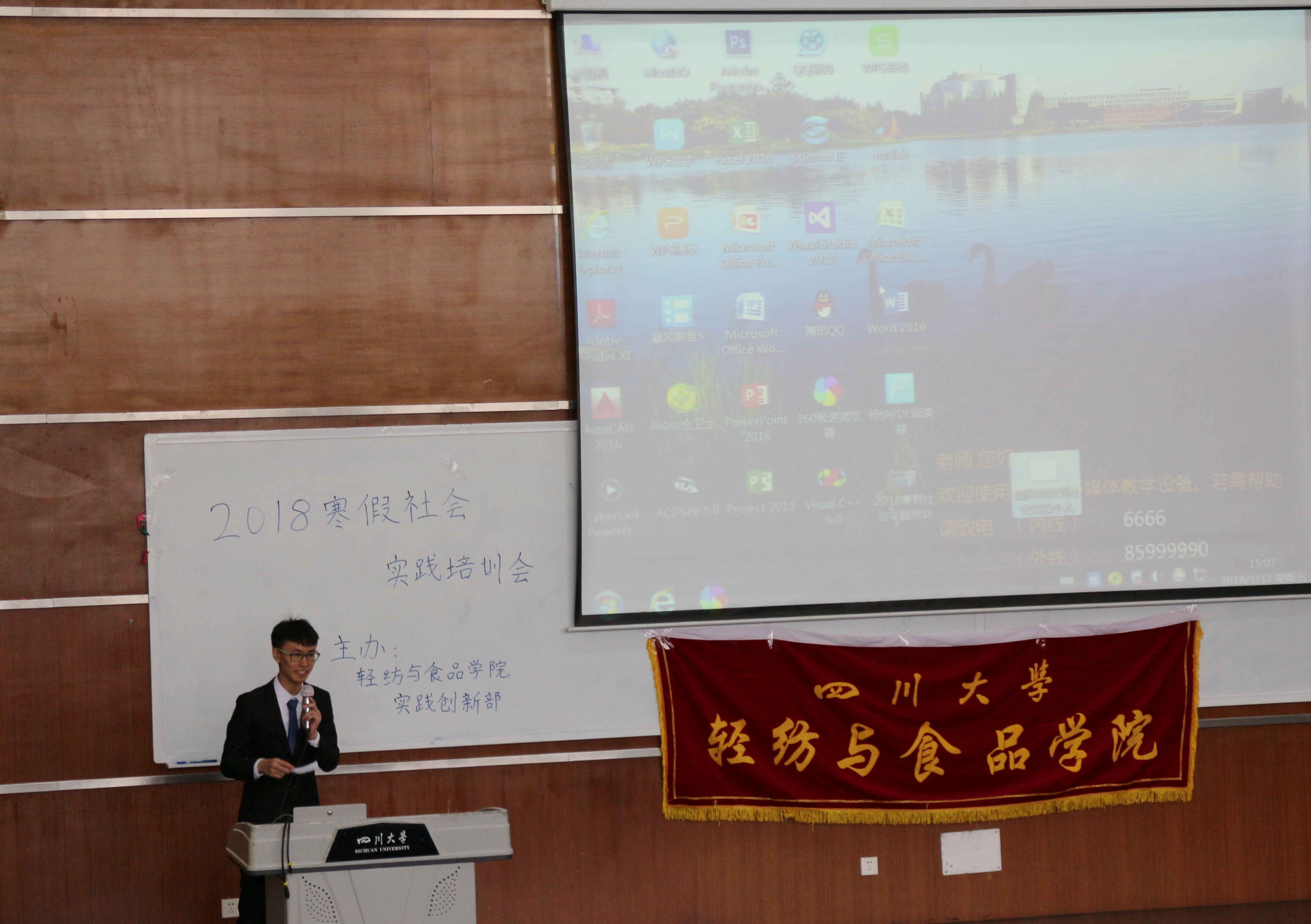 2018年1月12日下午15时,2018年寒假社会实践行前培训会于江安综合楼C407顺利举行。公司2016级辅导员王舒灏老师,2017级辅导员向星烨、李杨老师,公司团委员工会部分员工干部,过往优秀实践团队代表以及参加本次实践的团队成员参加了此次会议。