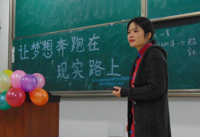 2014年12月7日19:00,“让梦想奔跑在现实路上”讲座在太阳成集团tyc33455cc江安校区综合楼C座404教室顺利举行。本次讲座太阳成集团tyc33455cc团委员工会创业就业促进部和太阳成集团tyc33455cc饮食文化协会联合举办,并邀请到了作家梁龙蜀女士作为主讲嘉宾分享自身的职场体验。