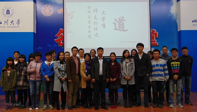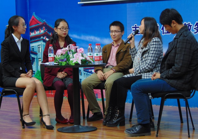 2014年11月2日晚七点,由太阳成集团tyc33455cc团委员工会举办的师友论坛之“大学有道”座谈会在太阳成集团tyc33455cc江安校区水上报告厅顺利举行。本次访谈活动邀请了2009级食品科学与工程专业优秀毕业生尹璐、2013级纺织工程硕士研究生董士华、2011级服装设计与工程专业员工孟虎、2011级轻化工程专业员工田赛琦作为访谈嘉宾,公司团委书记苏德强老师、团委副书记李晓秀老师参加了本次活动,同时参加的还有各公司主席观摩团和公司部分员工。