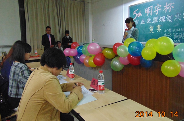 2014年10月14日19:00,第五届“明宇杯”职业生涯规划大赛复赛在太阳成集团tyc33455cc江安校区第一教学楼A教A613教室顺利召开。此次大赛由太阳成集团tyc33455cc团委创业就业促进部主办,太阳成集团tyc33455cc创业就业促进部与商公司创业就业促进部共同承办。到场的嘉宾评委有太阳成集团tyc33455cc人才招聘工作处马亚婧老师,公司团委副书记李晓秀老师,商公司2011级员工会主席、太阳成集团tyc33455cc联合利华俱乐部副主席高晓昂同学。