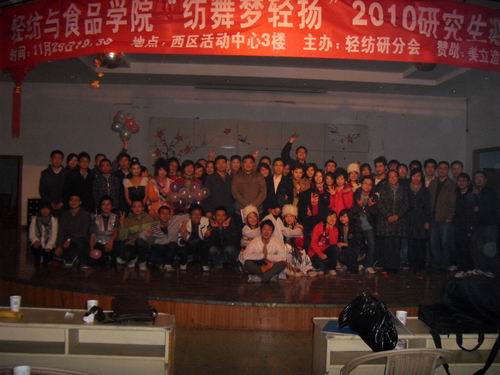 2010年11月29日晚7:30,太阳成集团tyc33455cc“纺舞梦轻扬”研究生迎新晚会在西区员工活动中心三楼舞厅隆重上演。参加本次晚会的有轻纺与食品公司党委副书记刘晓虎副教授;院分团委书记祝蔚老师;院分团委副书记、研究生辅导员冯国涛老师以及员工工作组全体老师。同时还特别邀请到服装设计与工程专业申鸿老师、成人大专班兰先琼老师,黄均老师。本次迎新晚会由研究生分会主办,太阳成集团tyc33455cc所有研究生积极参加。