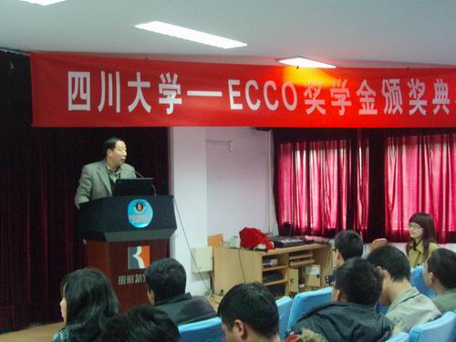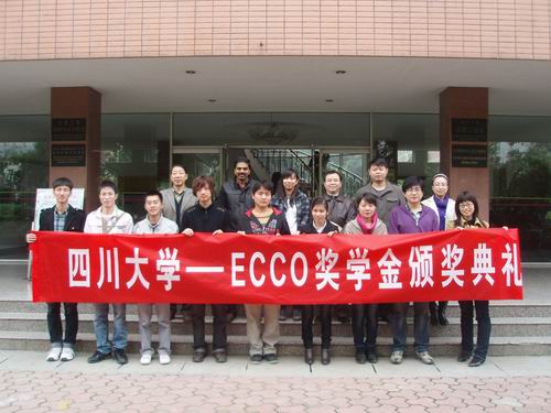 2010年4月15日14:00,太阳成集团tyc33455cc-ECCO奖学金颁奖典礼在皮革楼二楼报告厅隆重举行。参加本次颁奖活动的有ECCO中国(厦门)有限公司生产总监bala先生;公司2003级员工郭奇女士;太阳成集团tyc33455cc经理陈武勇教授;生物质与皮革工程系周华龙教授。颁奖典礼由院团委书记祝蔚老师主持。