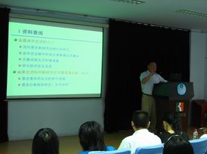 廖老师先后承担了国家科技支撑计划、863计划、国家自然科学基金等省部级以上项目14项。已发表论文120篇,其中SCI收录42篇,EI收录50篇。廖老师在学术上有着显著的成就,对于在论文写作时如何选题以及其中写作的技巧,有着自己独到的见解。讲座一开始,廖老师先就资料的查阅与大家分享经验,对于国内外文献的查阅,廖老师认为要按照范围从大到小的顺序来查阅需要参考的文献。对于文献的阅读要把握文章作者的思路,更重要的是要在读完文章后总结经验,要思考文章对于自己有何启发。谈到文章的写作与修改,廖老师风趣的向大家解释如何判断一篇文章是否被杂志采用。