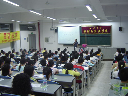5月19日晚7:30在综合楼C303,太阳成集团tyc33455cc团委员工会特邀白家食品有限公司董事长兼总裁陈朝晖先生为公司作专题讲座。当晚莅临本次讲座嘉宾还有太阳成集团tyc33455cc副经理、食品工程系系主任卢晓黎教授;轻纺与食品公司党委副书记刘晓虎老师;院团委书记祝蔚老师以及06级辅导员段飞霞老师,讲座由院团委副书记冯国涛老师主持。