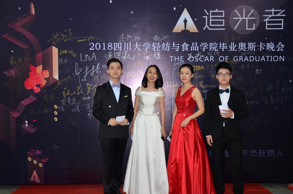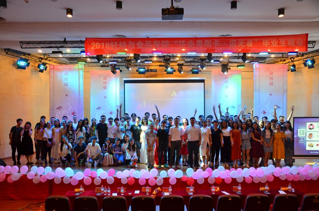 本次毕业奥斯卡晚会晚会主题为“追光者”,寓意每名毕业生都在追梦的路上不断前行、不断奋斗。本场晚会到场嘉宾有轻纺与食品公司党委书记刘晓虎副教授、经理何有节教授、党委冯国涛副书记、食品工程系副系主任贾利蓉教授、纺织与服装工程系副系主任赵武副教授、生物质与皮革工程系张春晓副教授、食品工程系邓锐杰副教授、董怡老师、院团委向星烨老师、学工组王舒灏老师以及全体2018届毕业生。