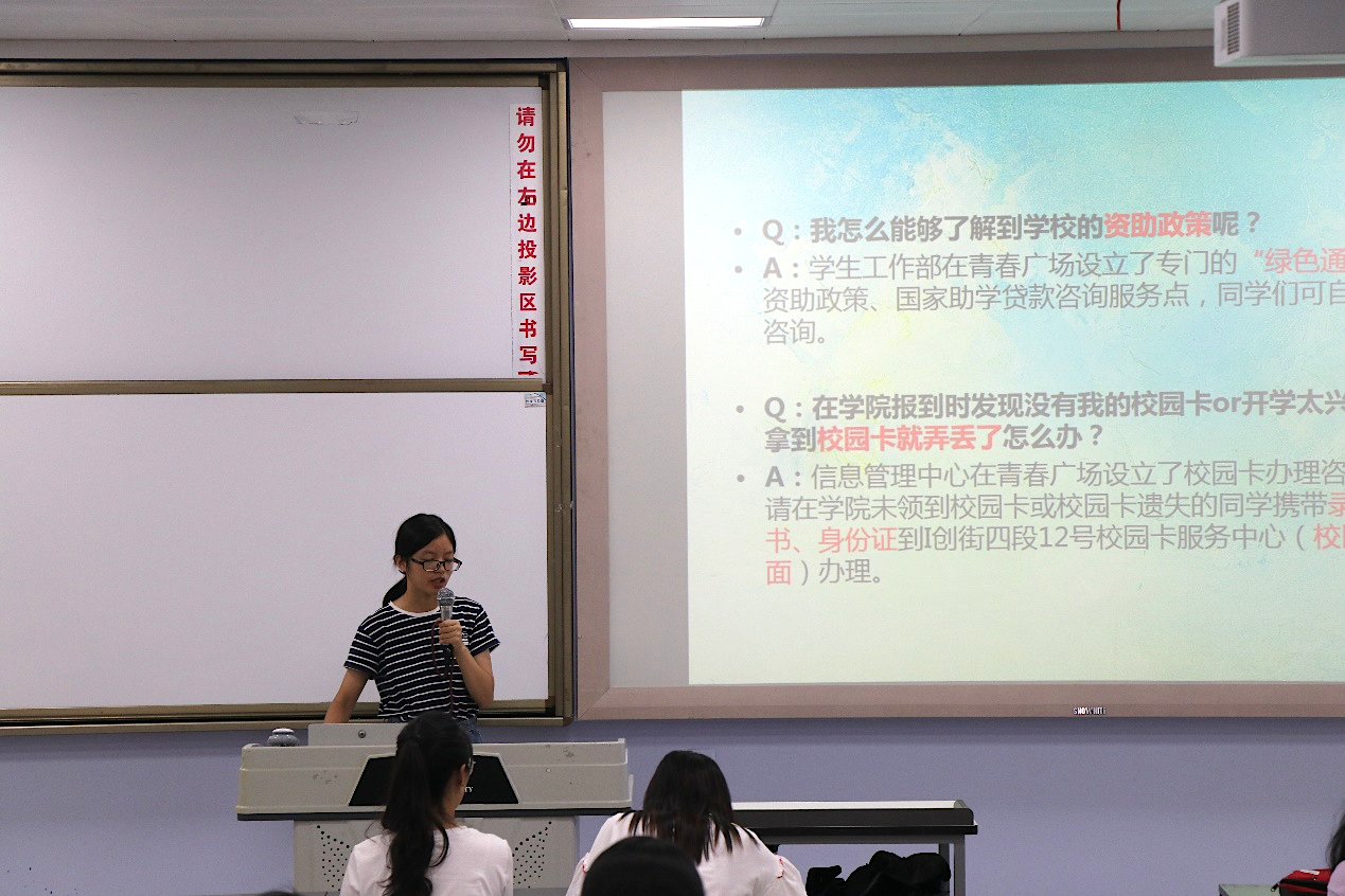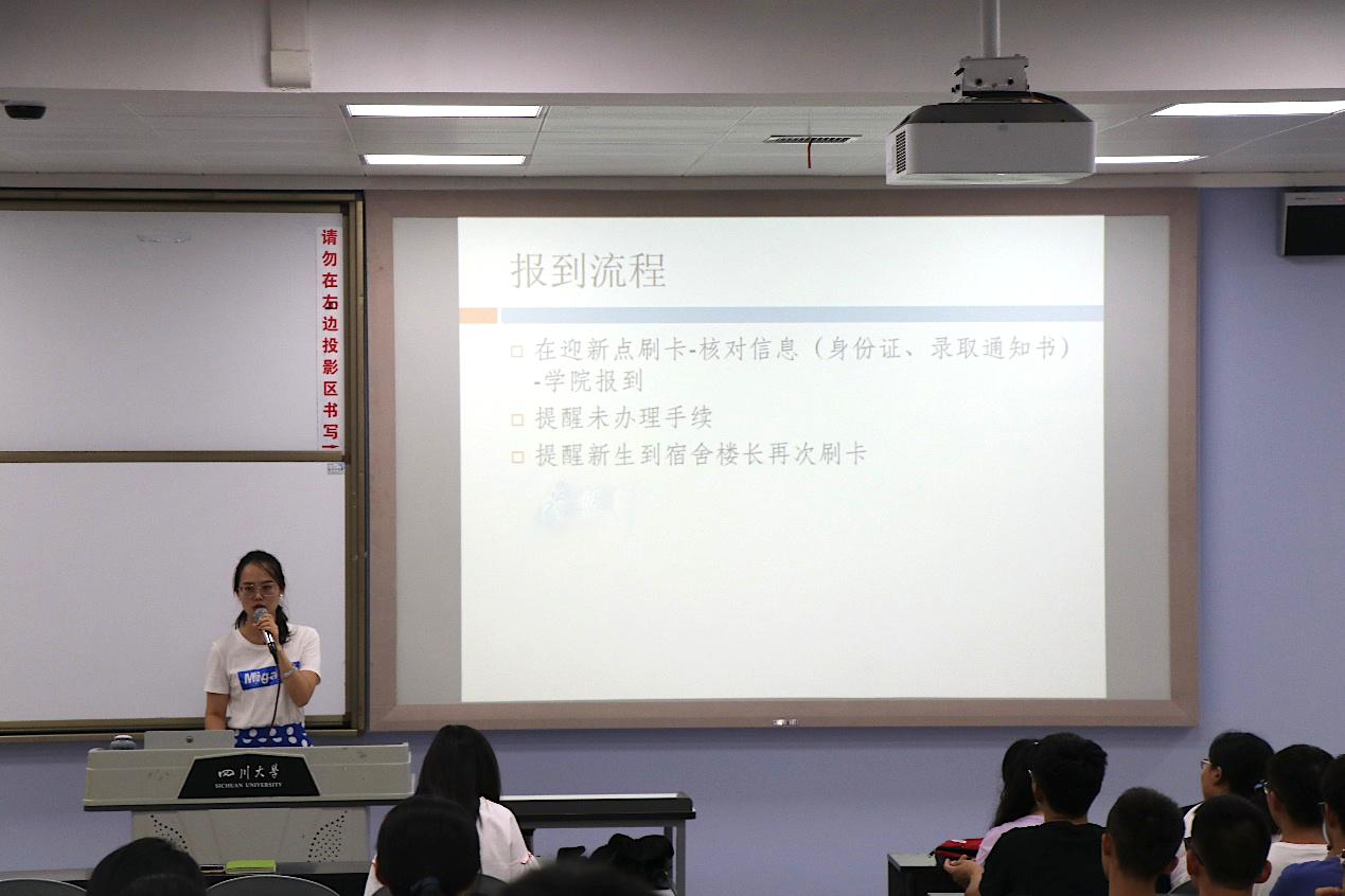 简短的开场白后,首先由杨赏娟同学对迎新工作进行介绍。她从新生所办理手续、志愿者具体工作安排、工作注意事项和答疑四个部分进行了详细的讲解。对繁琐的新生报到手续进行了强调,分别规定了迎新工作的各岗位的职能,并就各岗位具体工作安排进行注意事项提醒,还就新生可能存在的问题做出了回答。