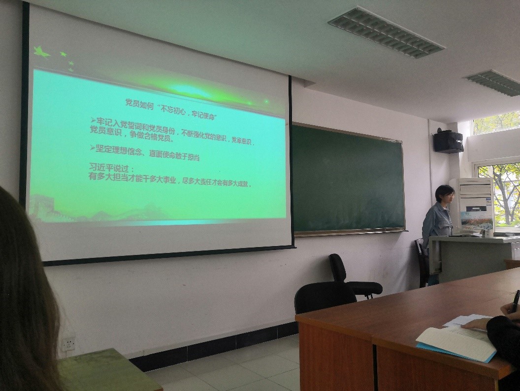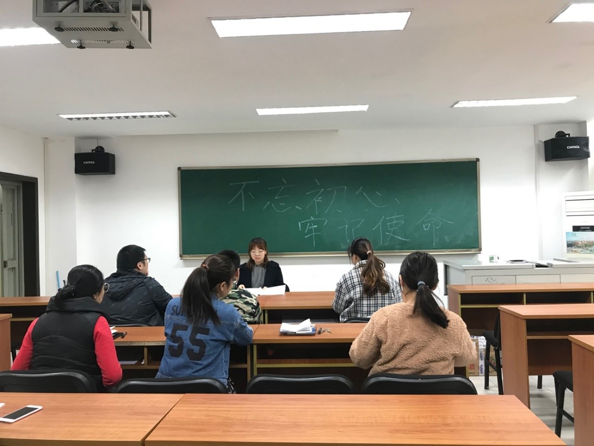 2019年10月24日,2017级皮革硕士党支部书记王诗婷同志在主题学习的组织生活会上,回顾了 “不忘初心,牢记使命”主题教育活动的背景,从“不忘初心,牢记使命”主题教育的意义、我们党的“初心”和“使命”是什么、为什么要不忘初心牢记使命,以及如何才能不忘初心牢记使命四个方面讲述了自己的体会,鼓励党员同志们脚踏实地,将平凡的工作做好,并且要崇尚英雄、争做英雄,有远大的理想和抱负。