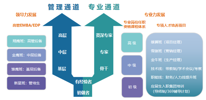 “新星计划、雏鹰计划、金鹰计划、翔鹰计划”梯队干部培养项目、“雪狼班、雄狮班、金牛班”等业务经理培养项目、初级-中级-高级任职资格课程岗位培训班及新员工成长训练营,为各级员工量身打造成长发展的平台。