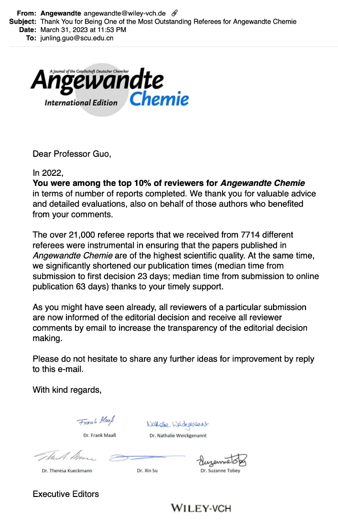 近日获悉,公司生物质与皮革工程系郭俊凌教授荣获国际著名化学期刊《德国应用化学》(Angewandte Chemie)颁发的2022年度杰出审稿人奖(Outstanding Referee)。《德国应用化学》是德国化学学会(Gesellschaft Deutscher Chemiker, GDCh)官方期刊,出版范围涵盖了化学研究的各个领域且持续保持领先地位,目前已成为世界化学领域最具学术影响力和品牌影响力的期刊。